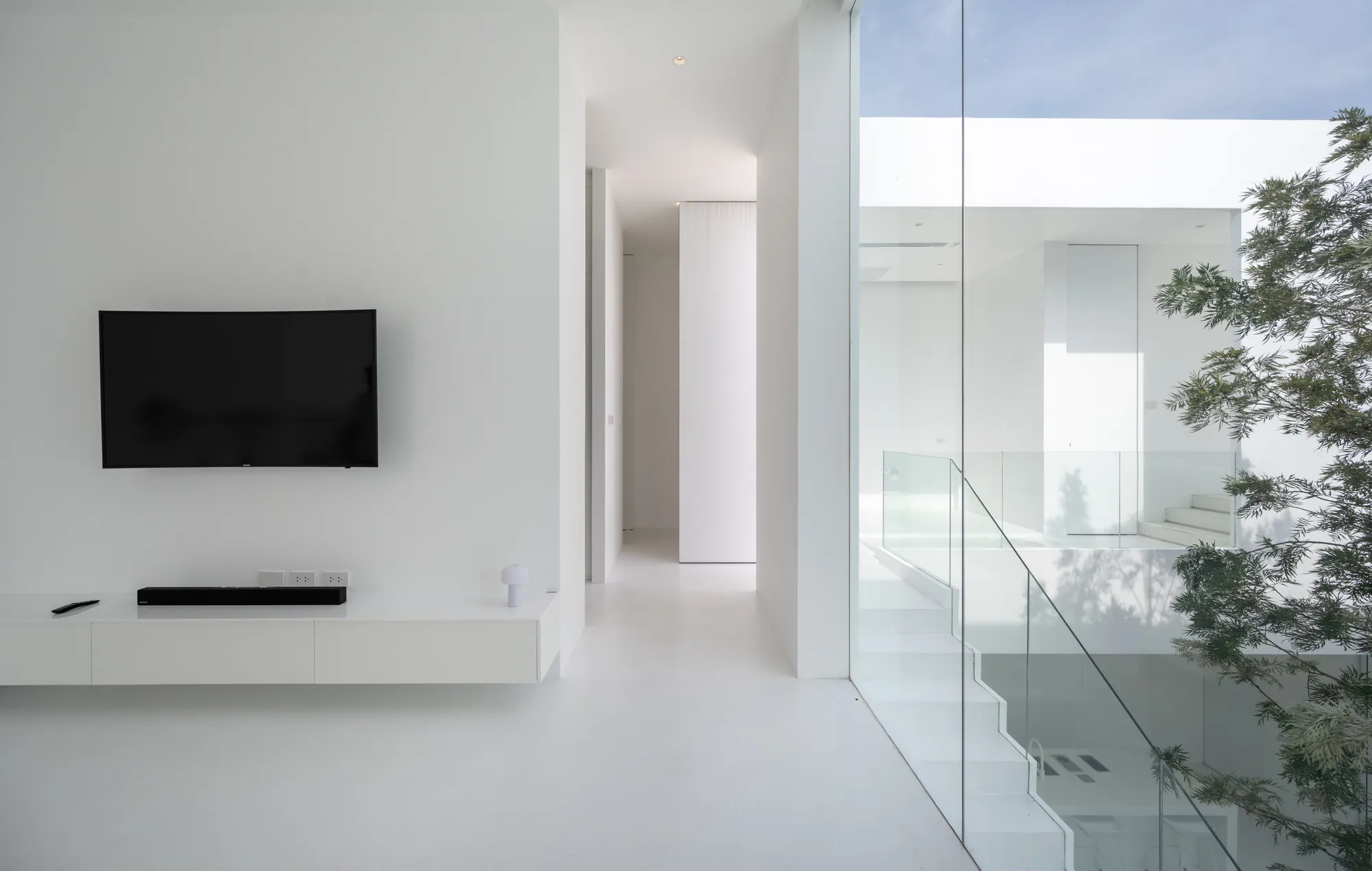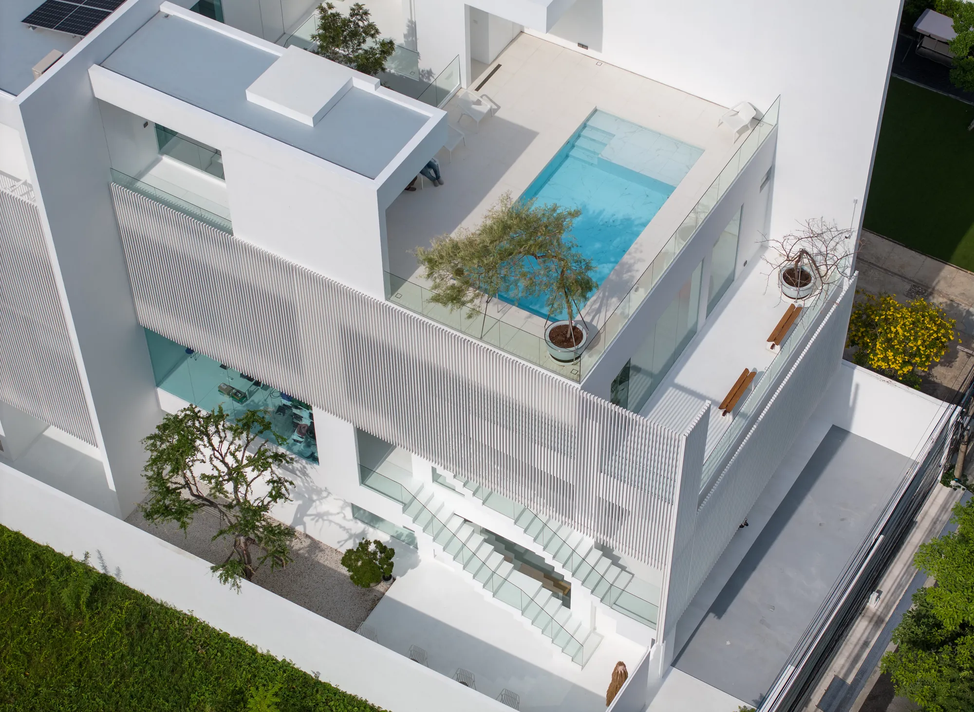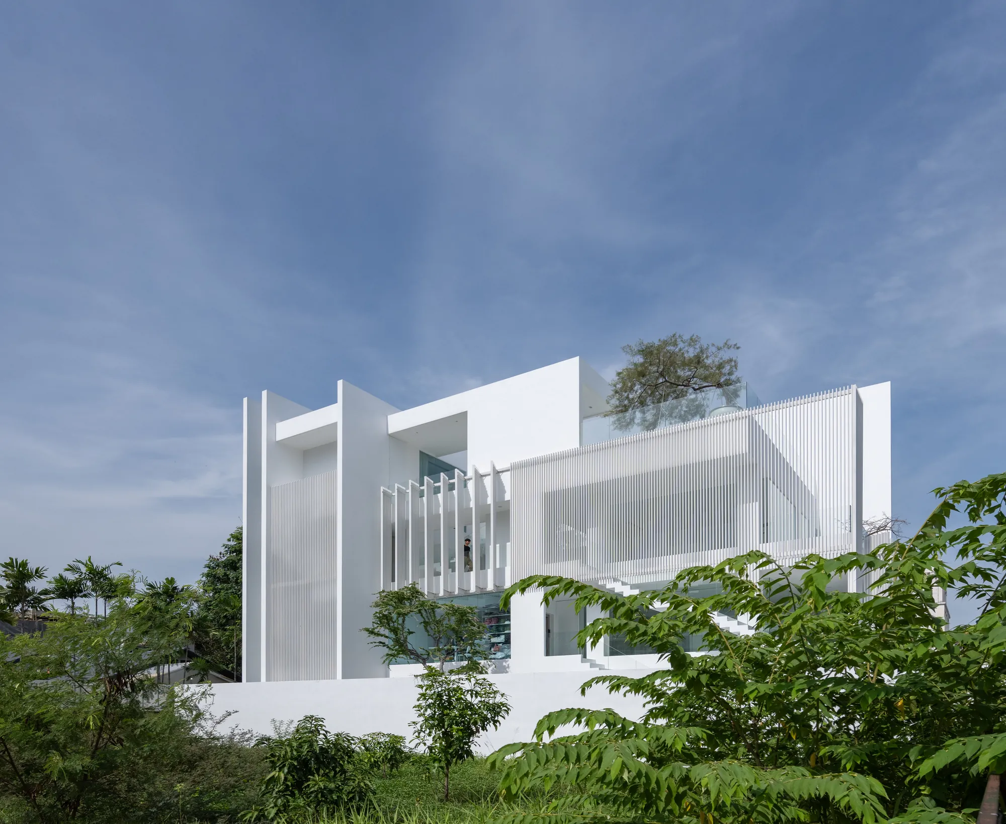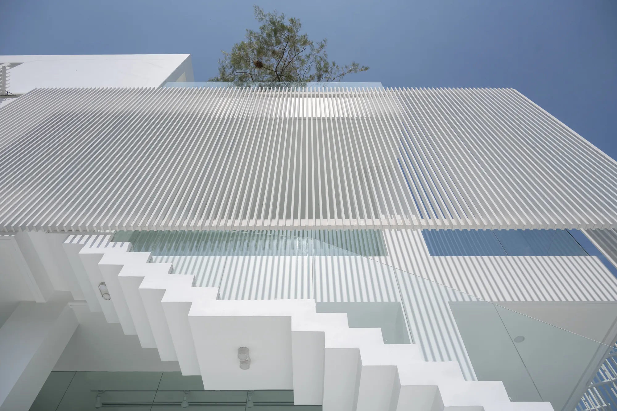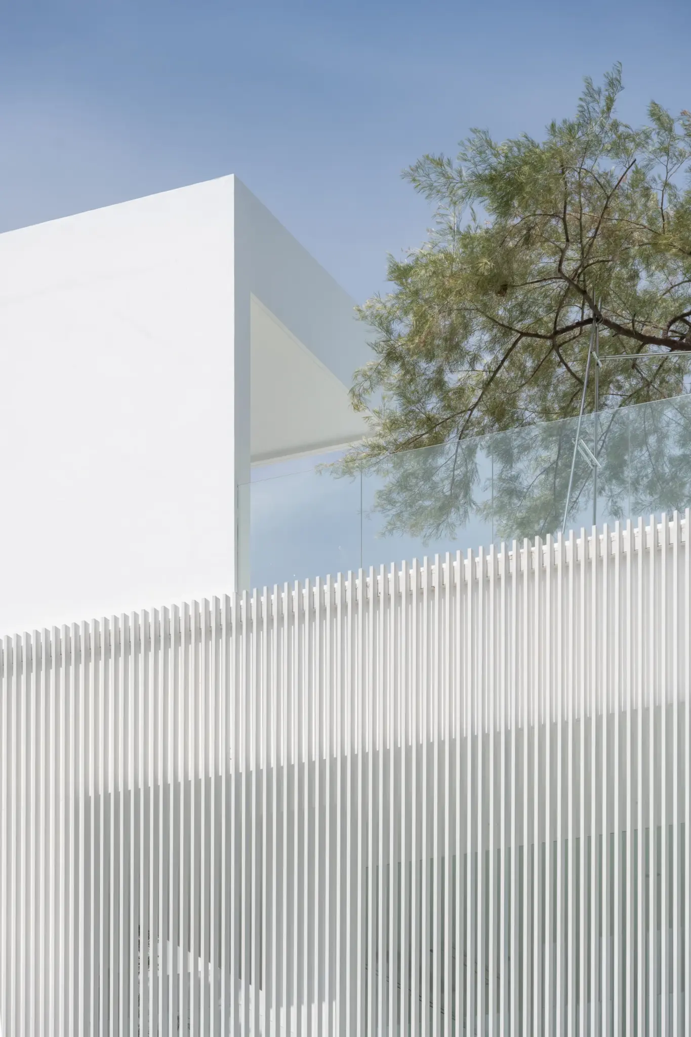 The architectural elements are designed starting with a large vertical white wall, which not only ensures privacy from neighboring residences but the design also allows for creating a seamless connection to the surroundings.