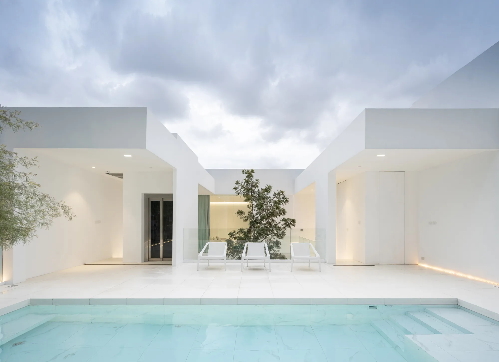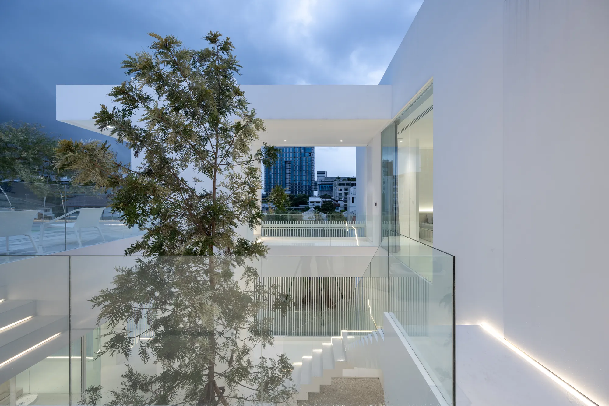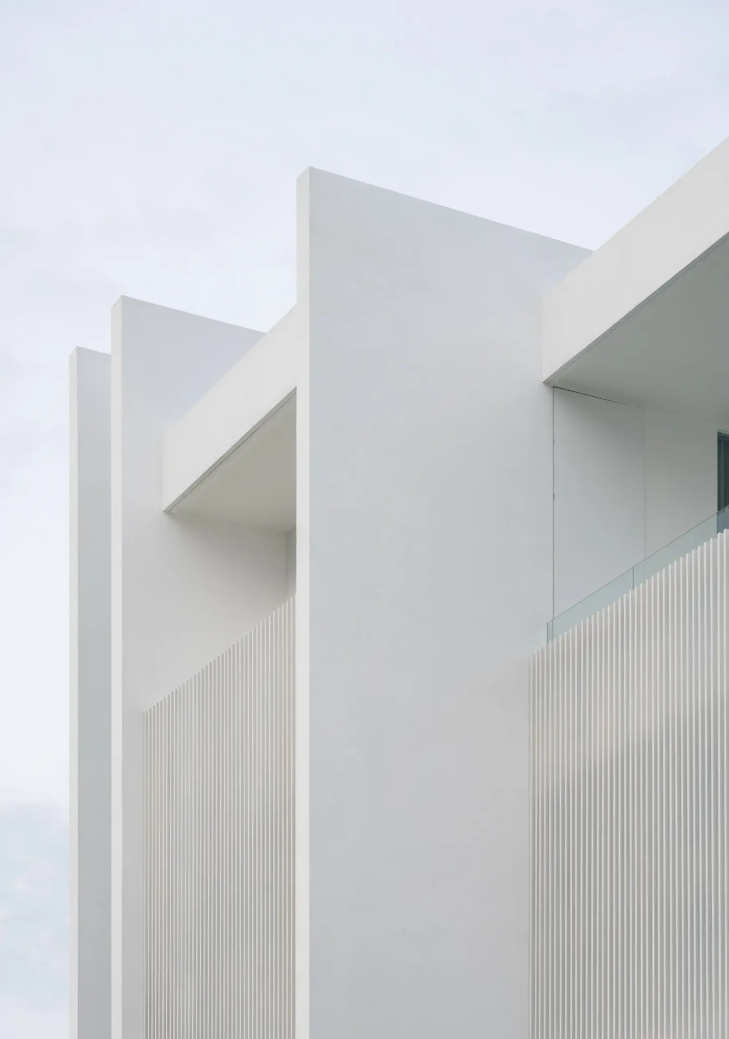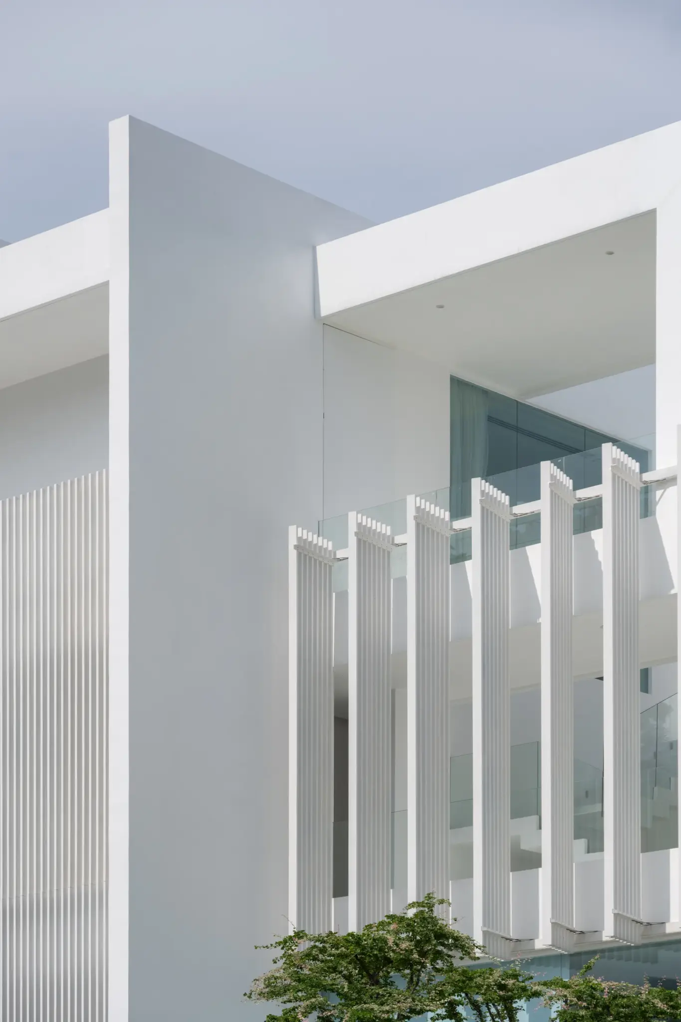 The architectural elements are designed starting with a large vertical white wall, which not only ensures privacy from neighboring residences but the design also allows for creating a seamless connection to the surroundings.