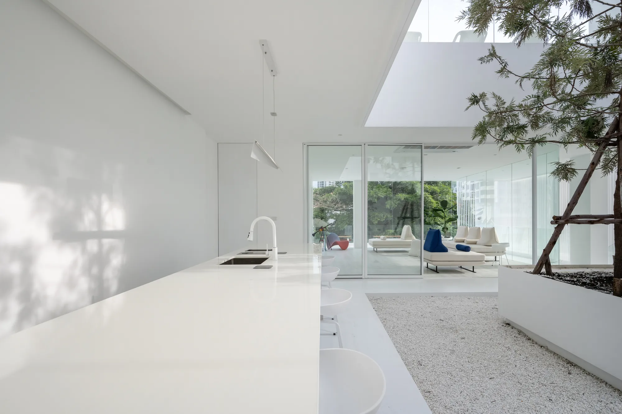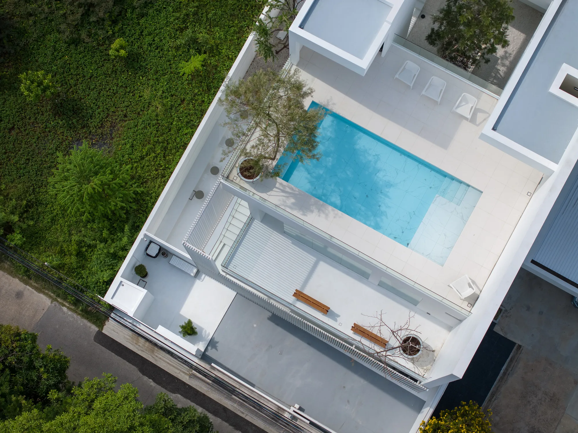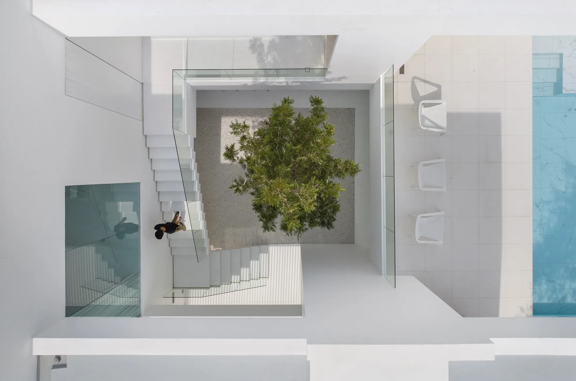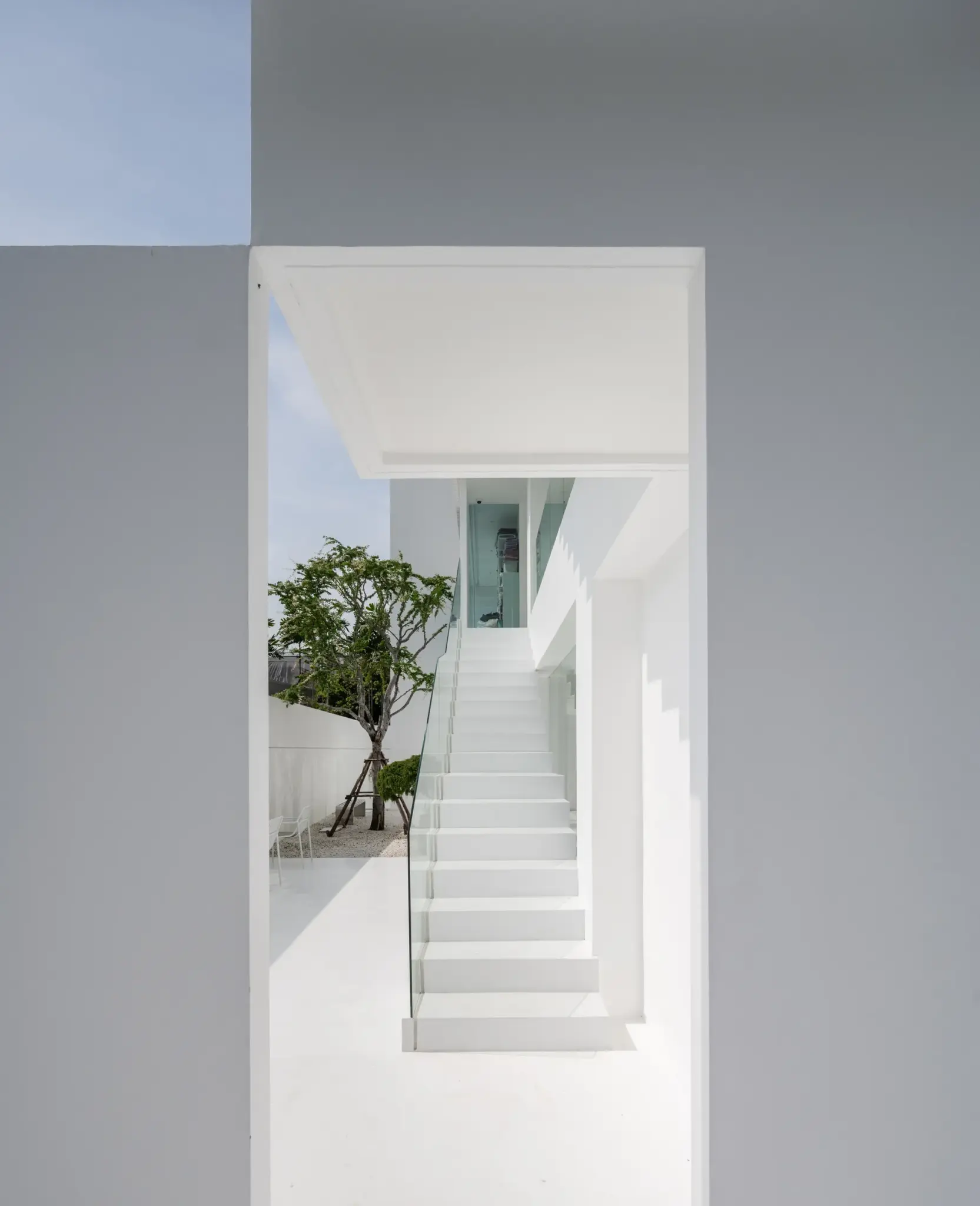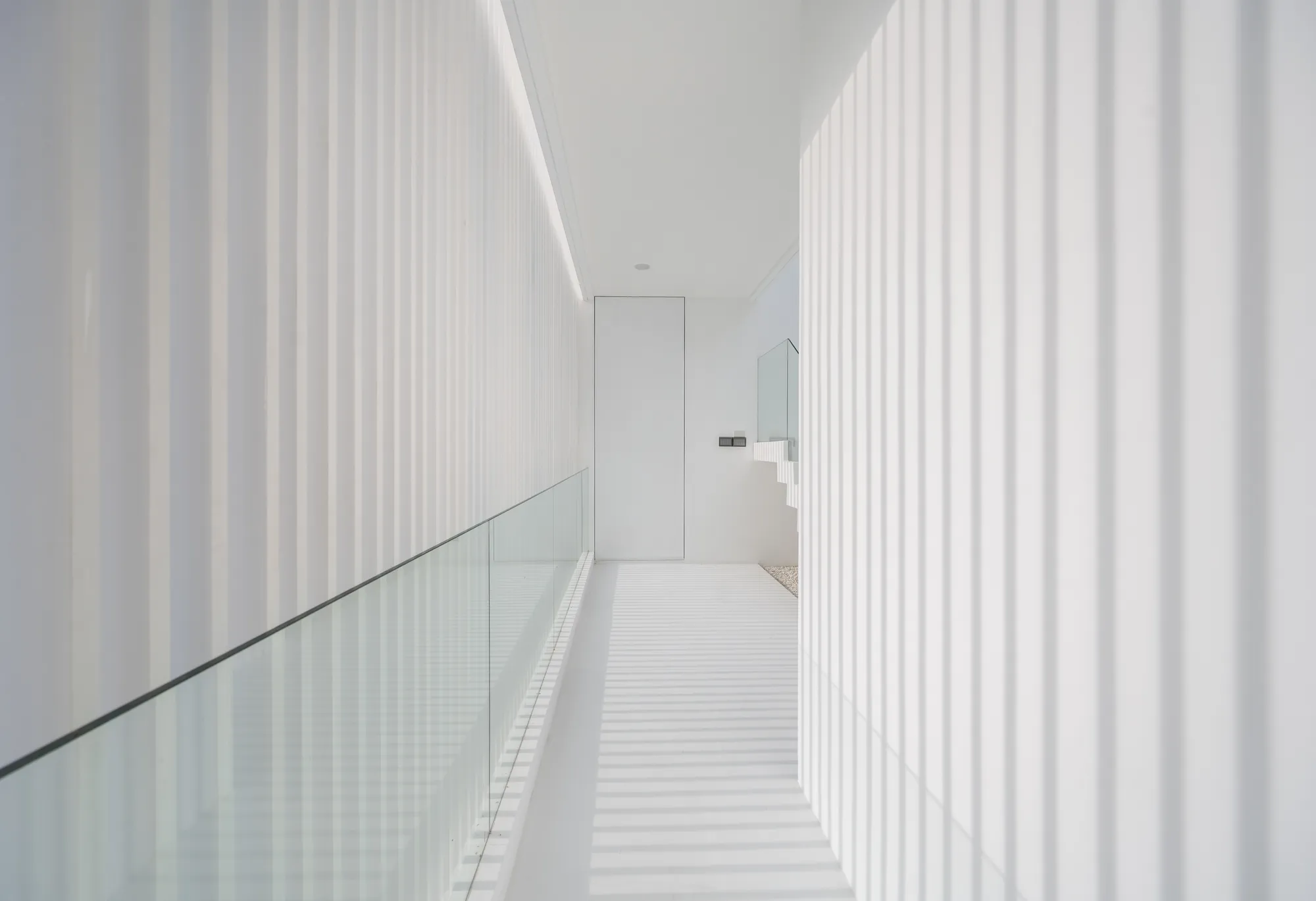 The architectural elements are designed starting with a large vertical white wall, which not only ensures privacy from neighboring residences but the design also allows for creating a seamless connection to the surroundings.