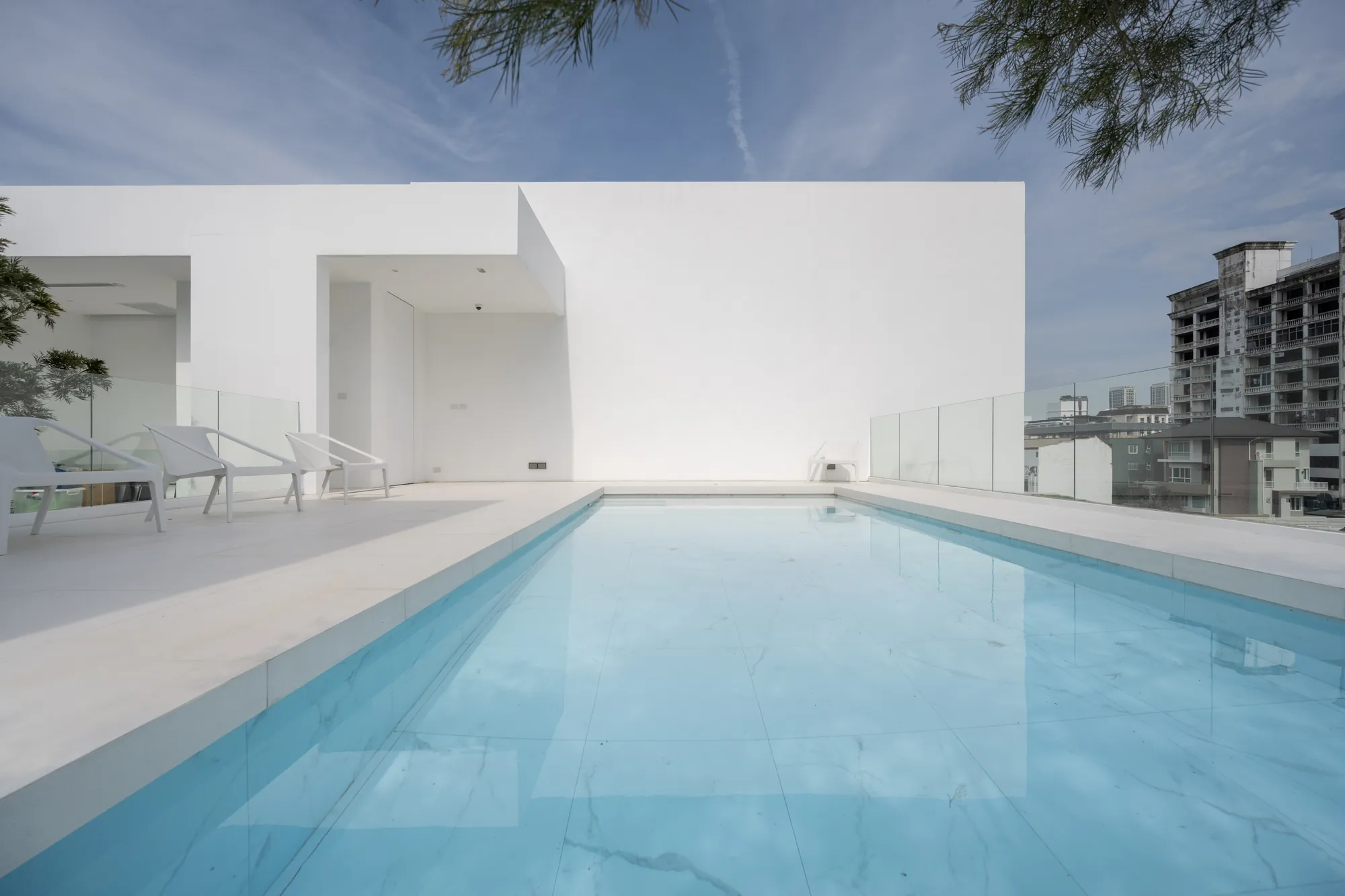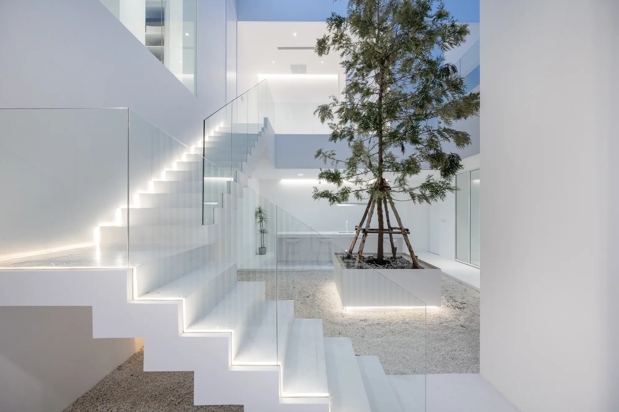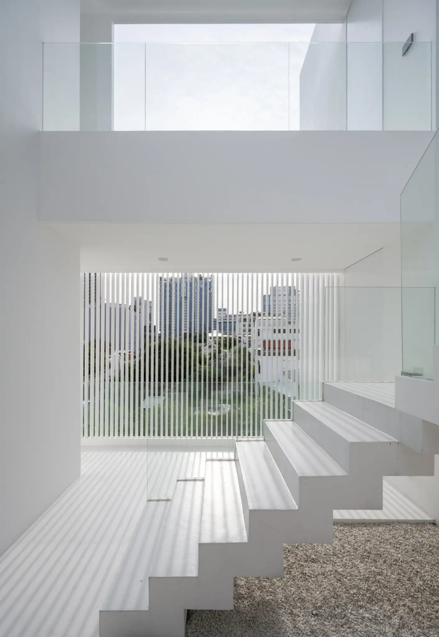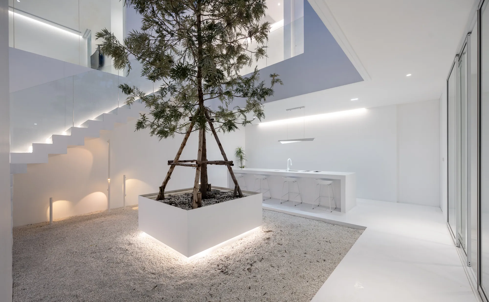 The architectural elements are designed starting with a large vertical white wall, which not only ensures privacy from neighboring residences but the design also allows for creating a seamless connection to the surroundings.