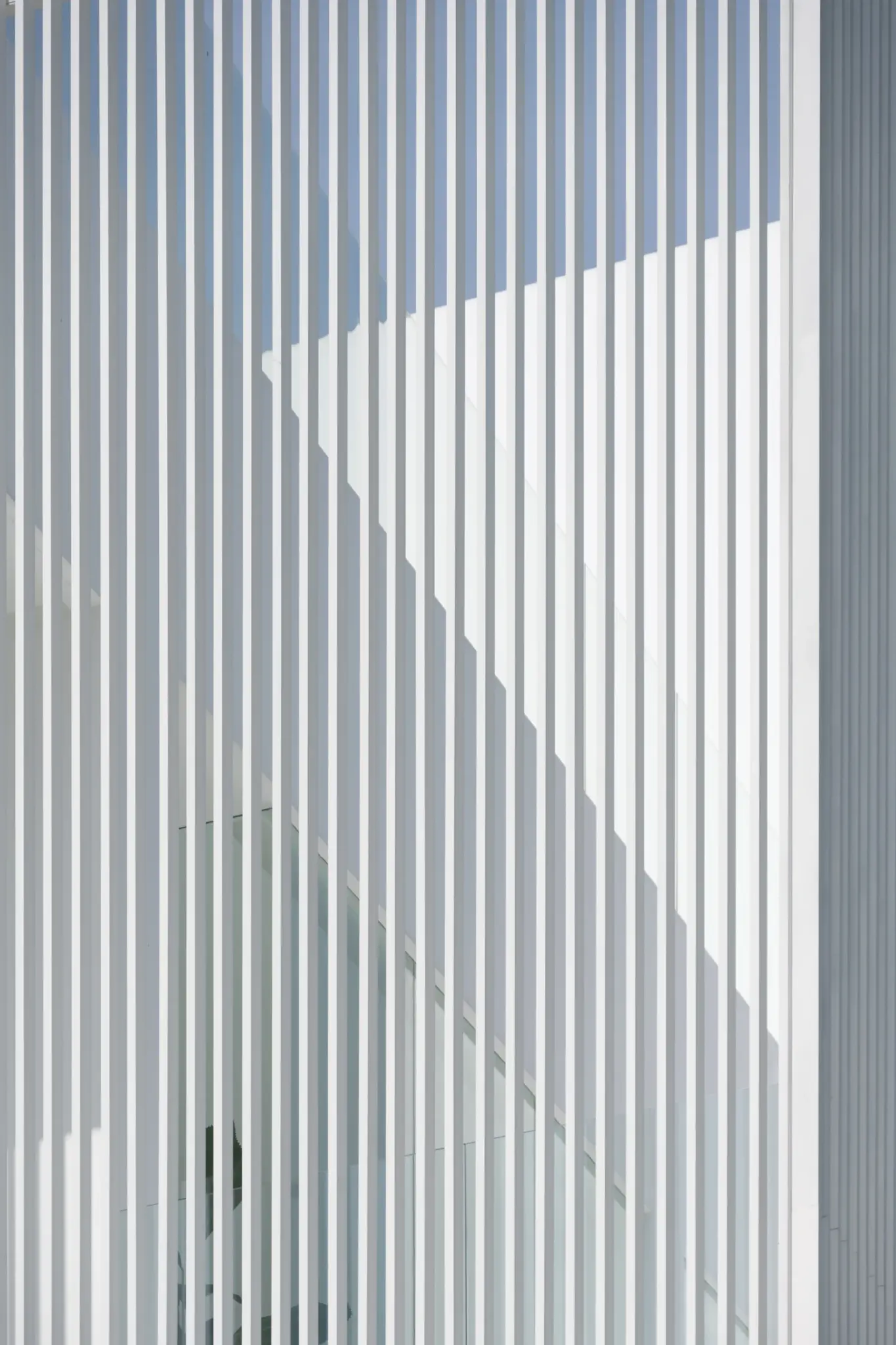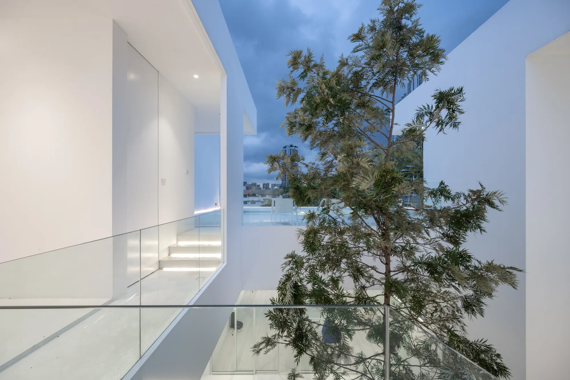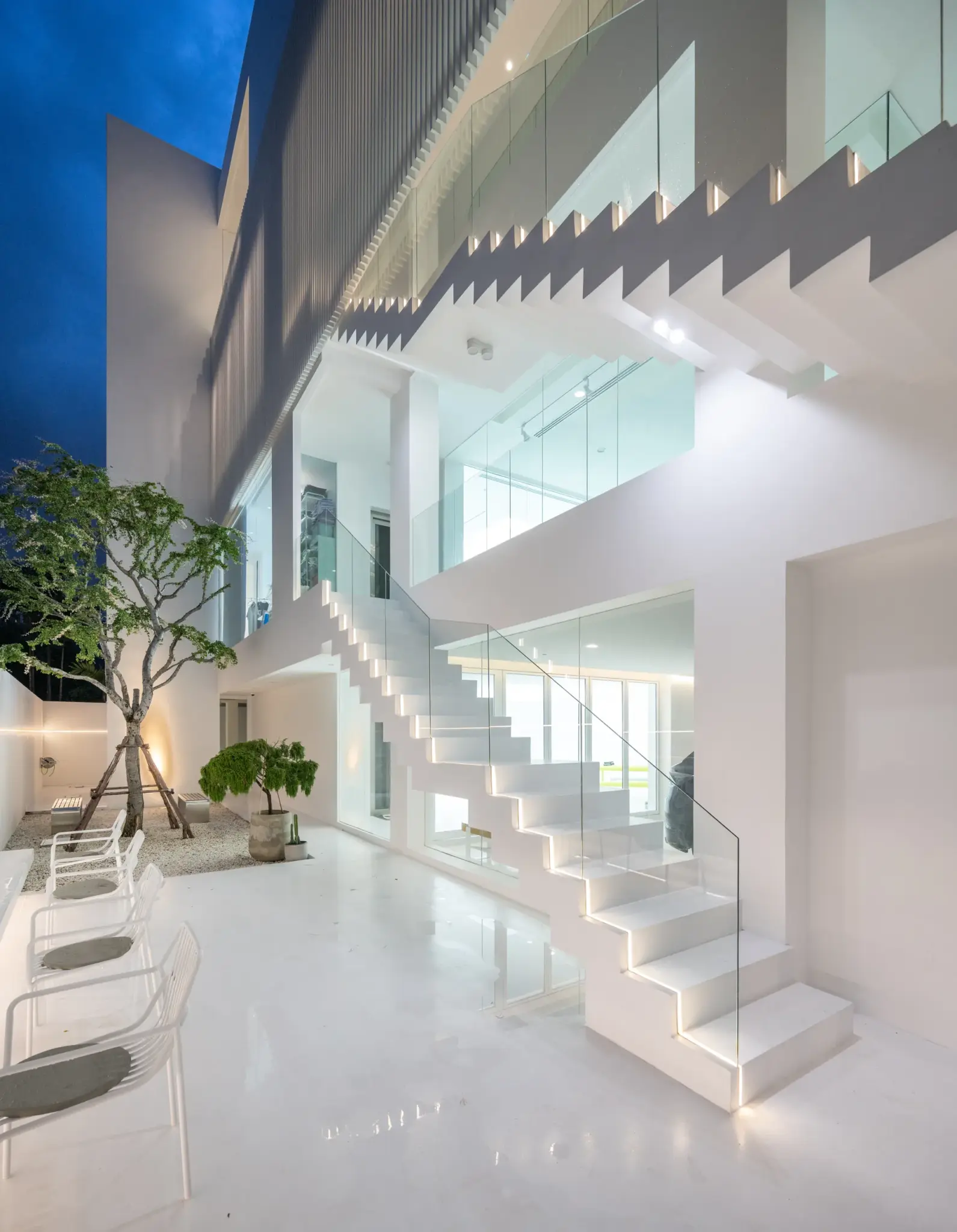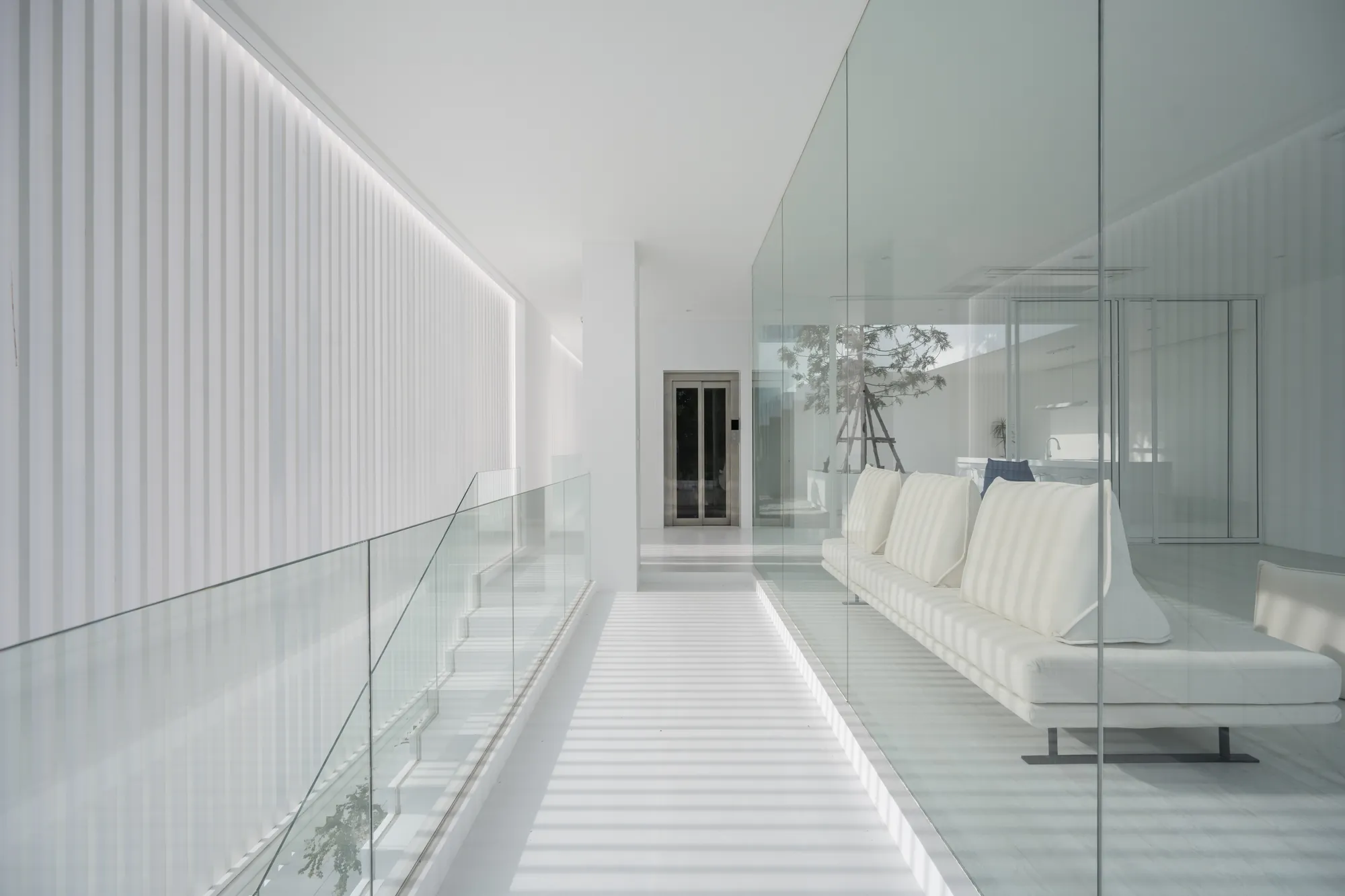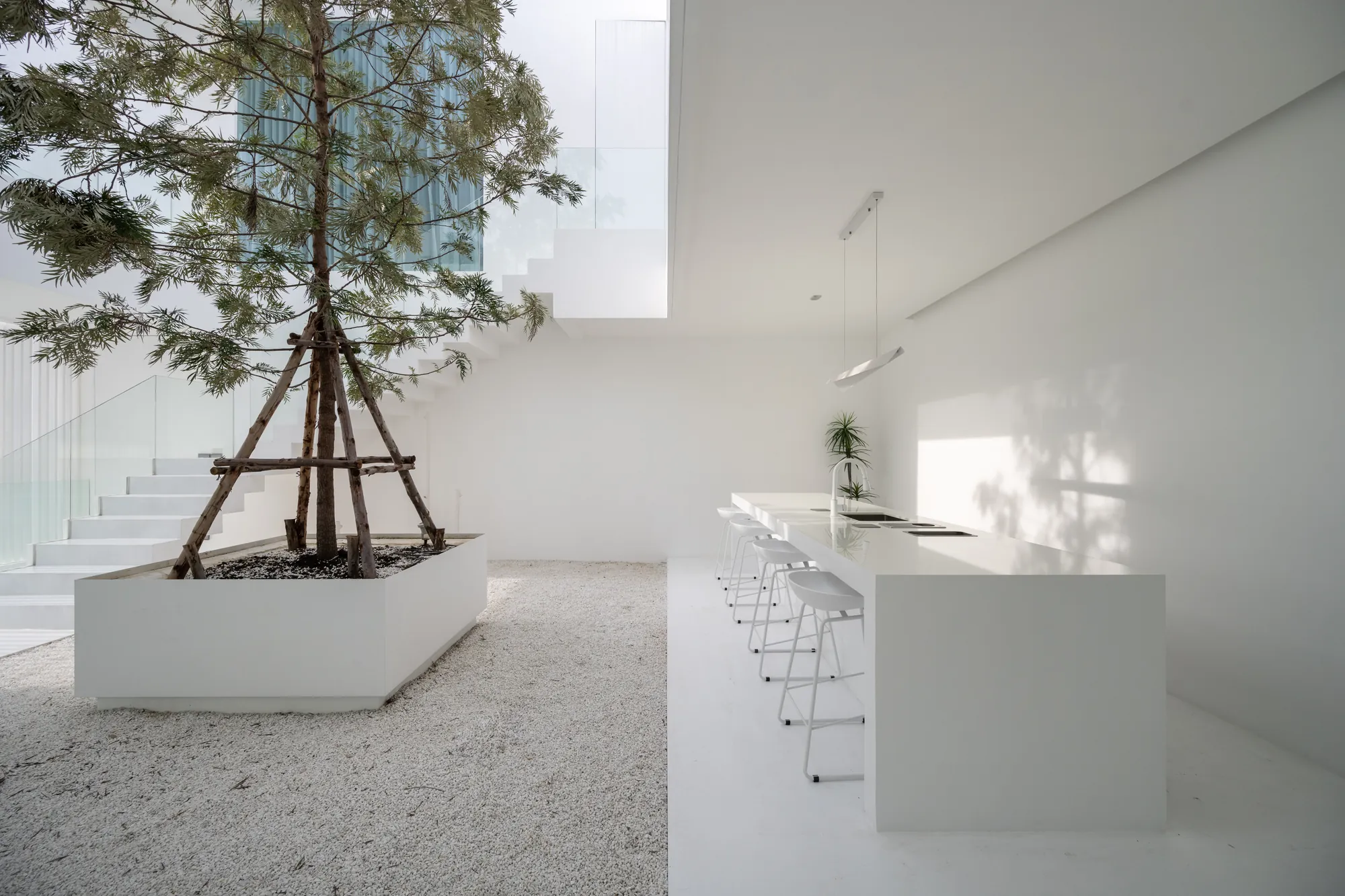 The architectural elements are designed starting with a large vertical white wall, which not only ensures privacy from neighboring residences but the design also allows for creating a seamless connection to the surroundings.