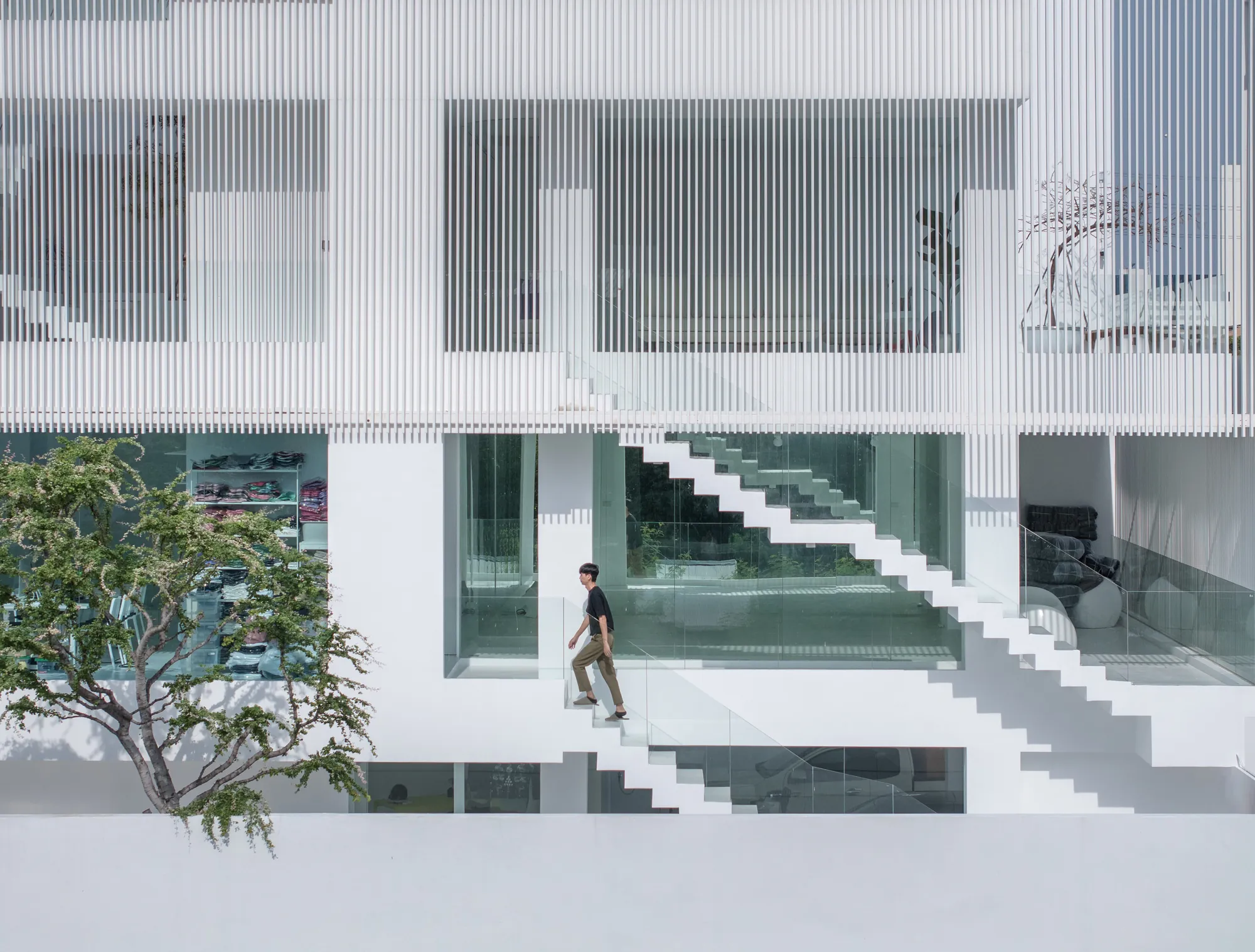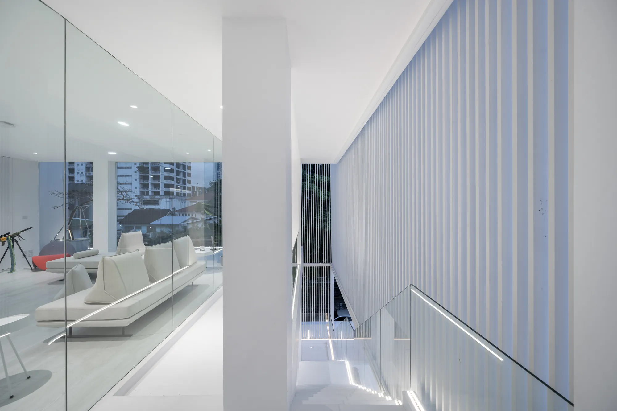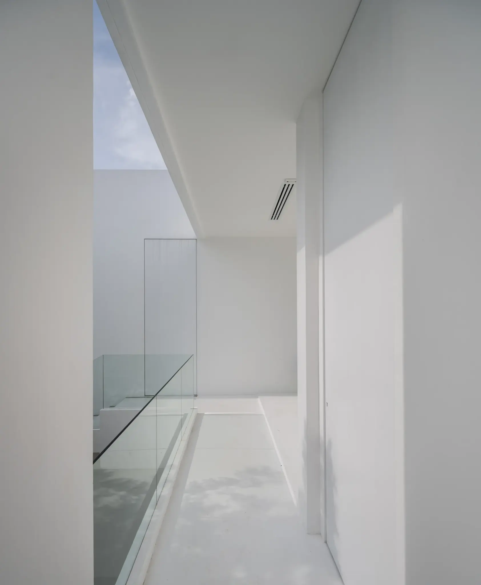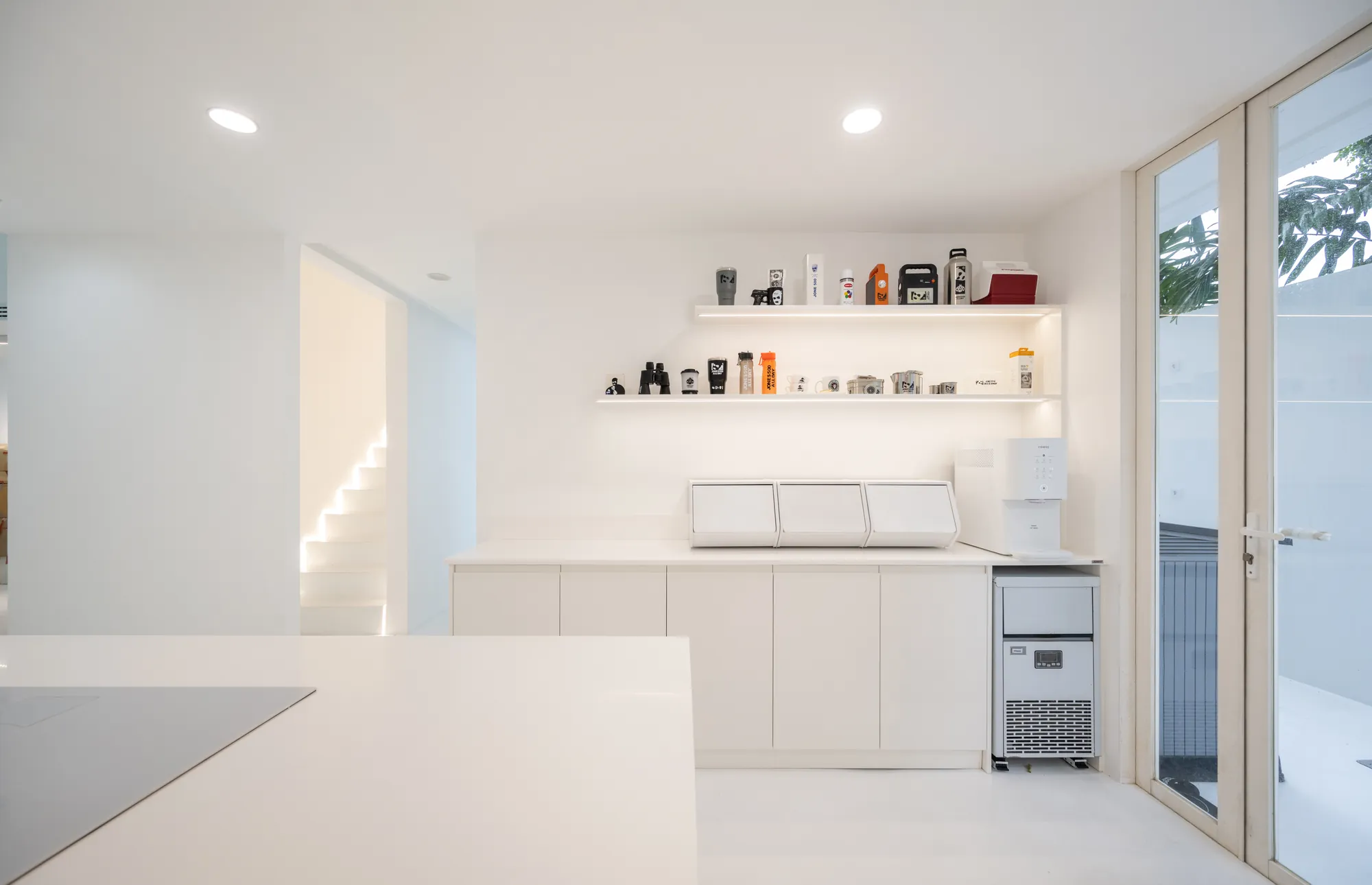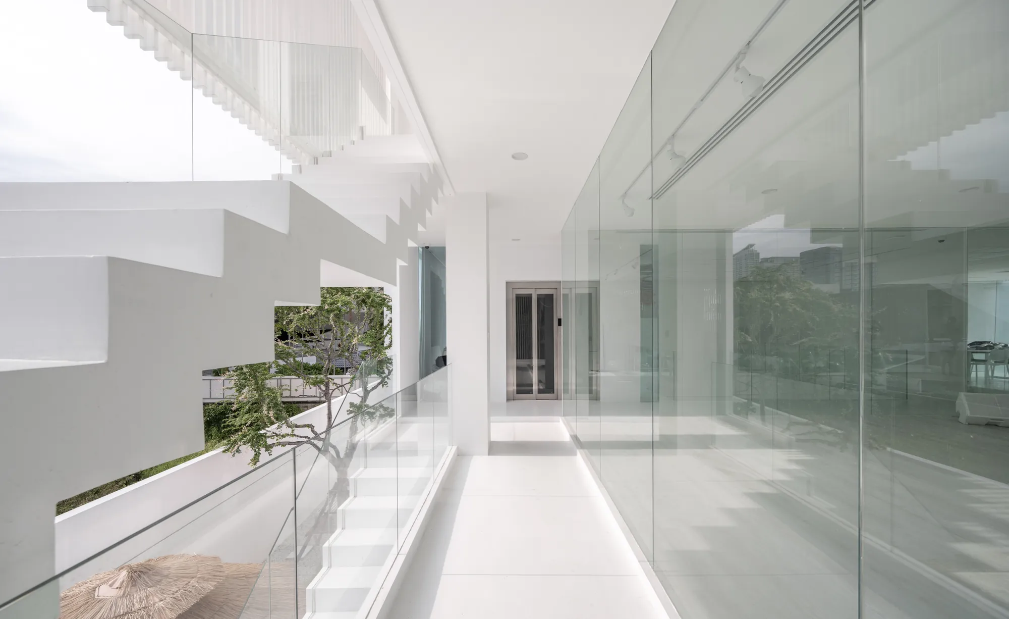 The architectural elements are designed starting with a large vertical white wall, which not only ensures privacy from neighboring residences but the design also allows for creating a seamless connection to the surroundings.