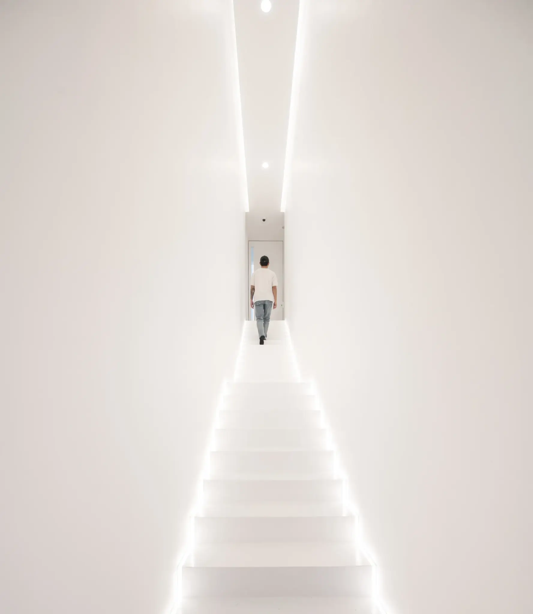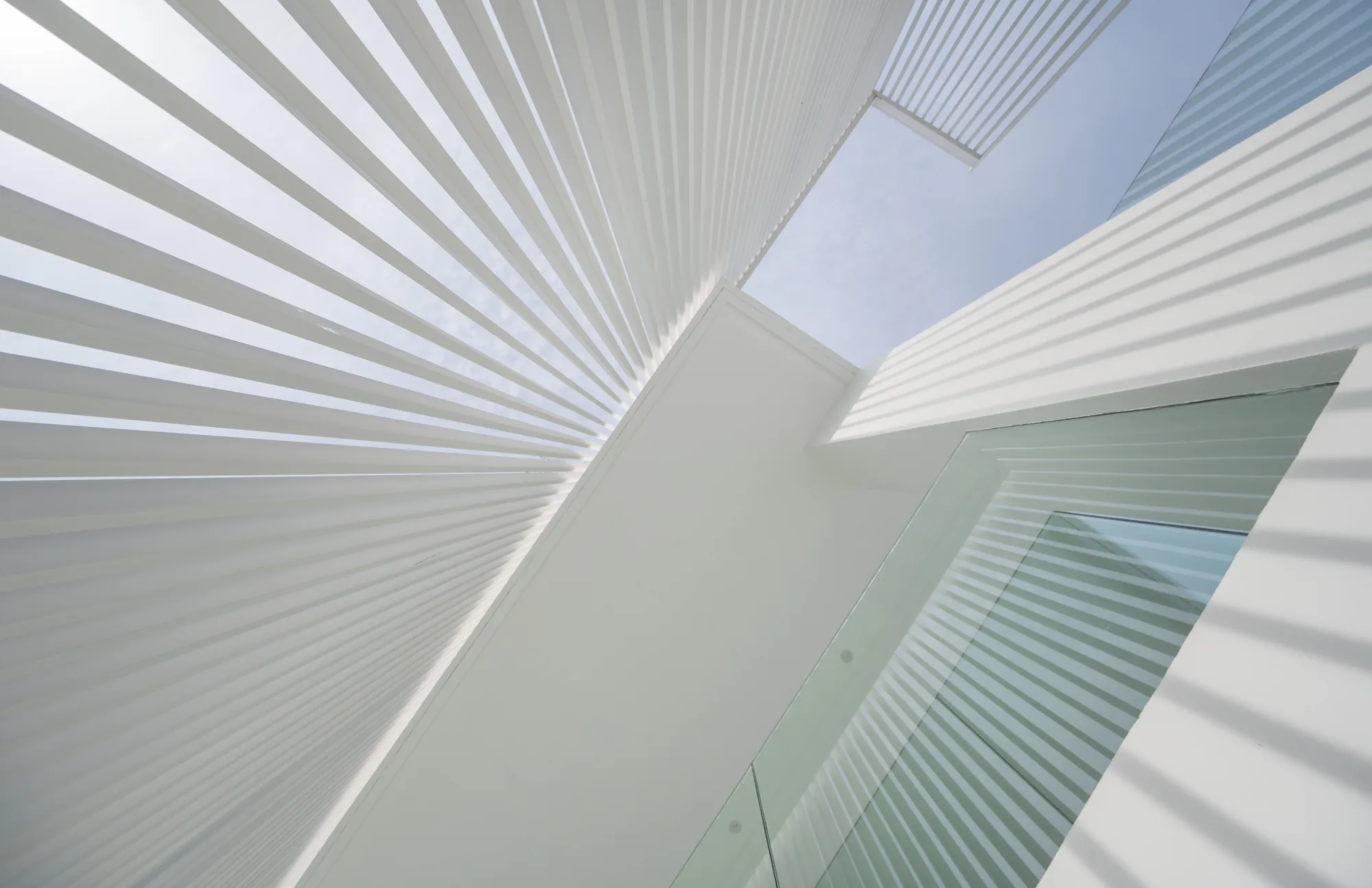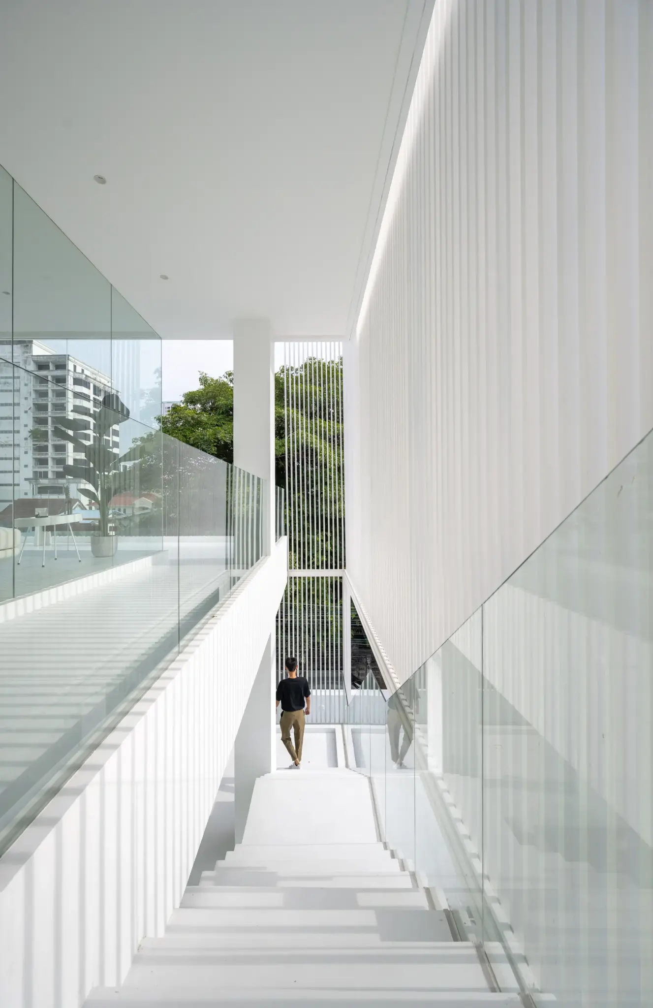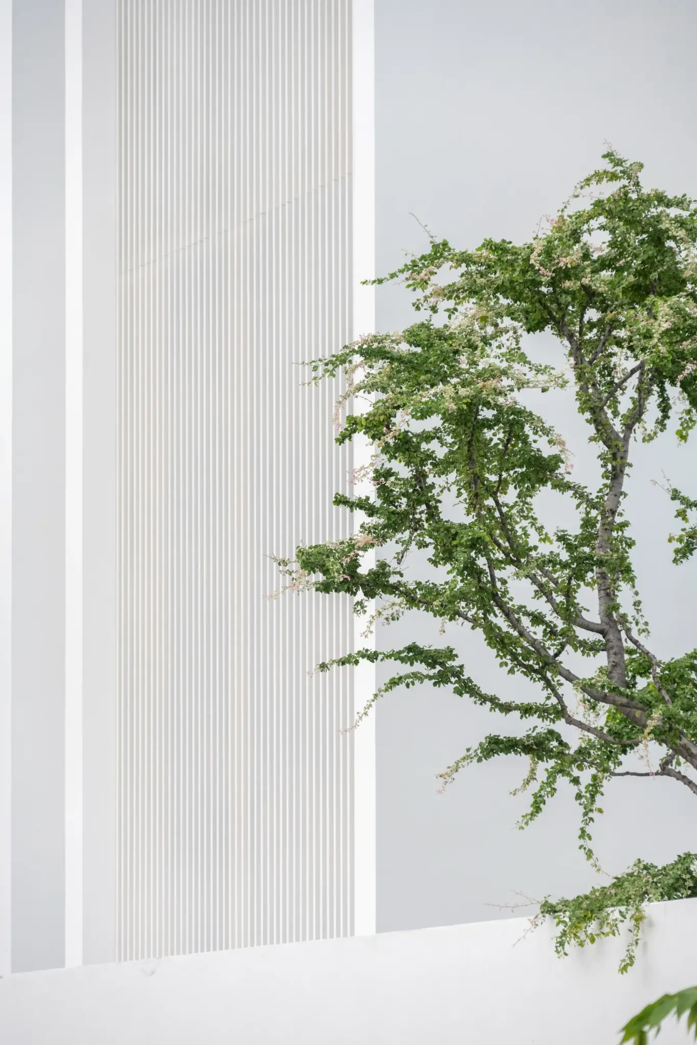 The architectural elements are designed starting with a large vertical white wall, which not only ensures privacy from neighboring residences but the design also allows for creating a seamless connection to the surroundings.