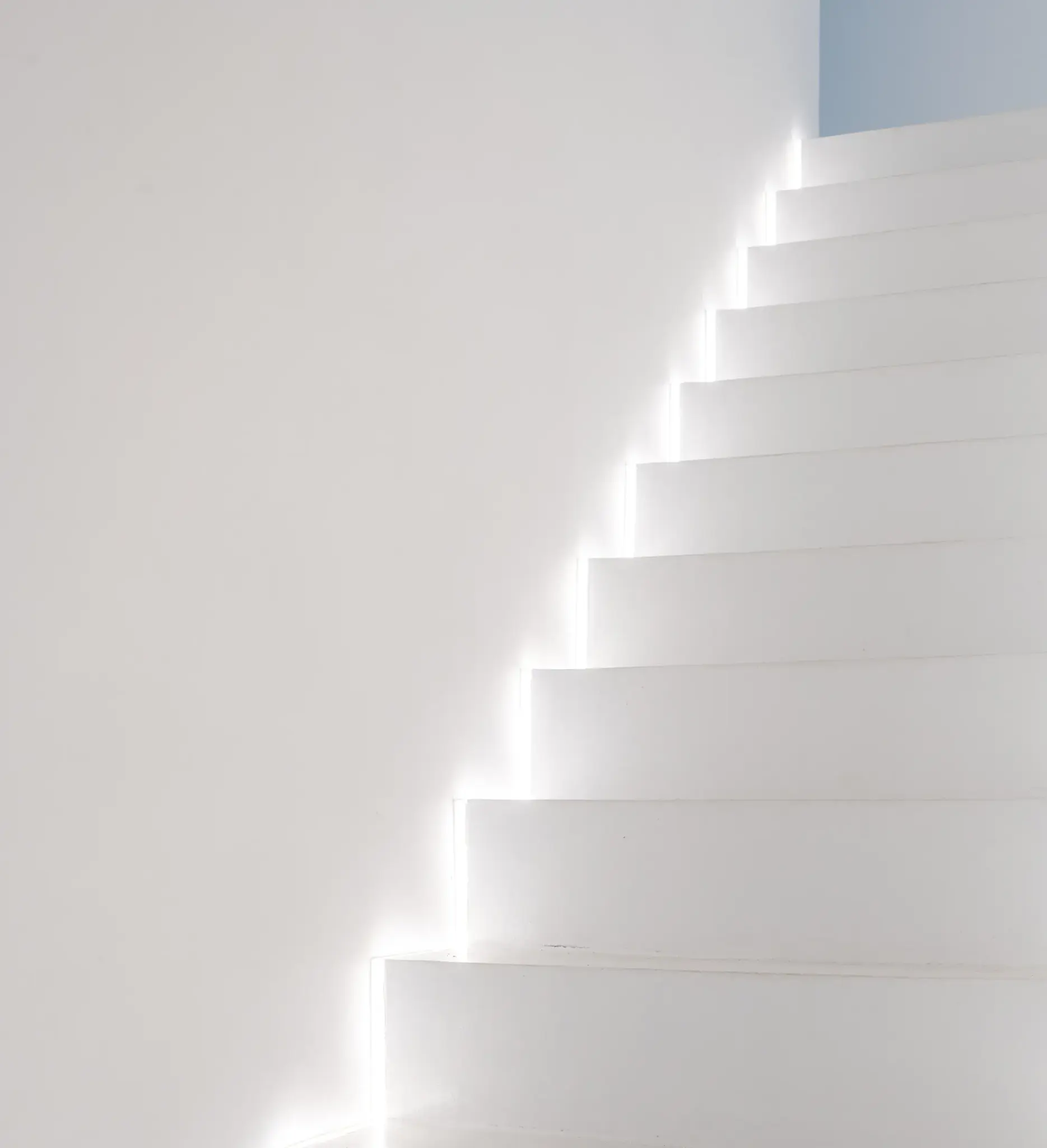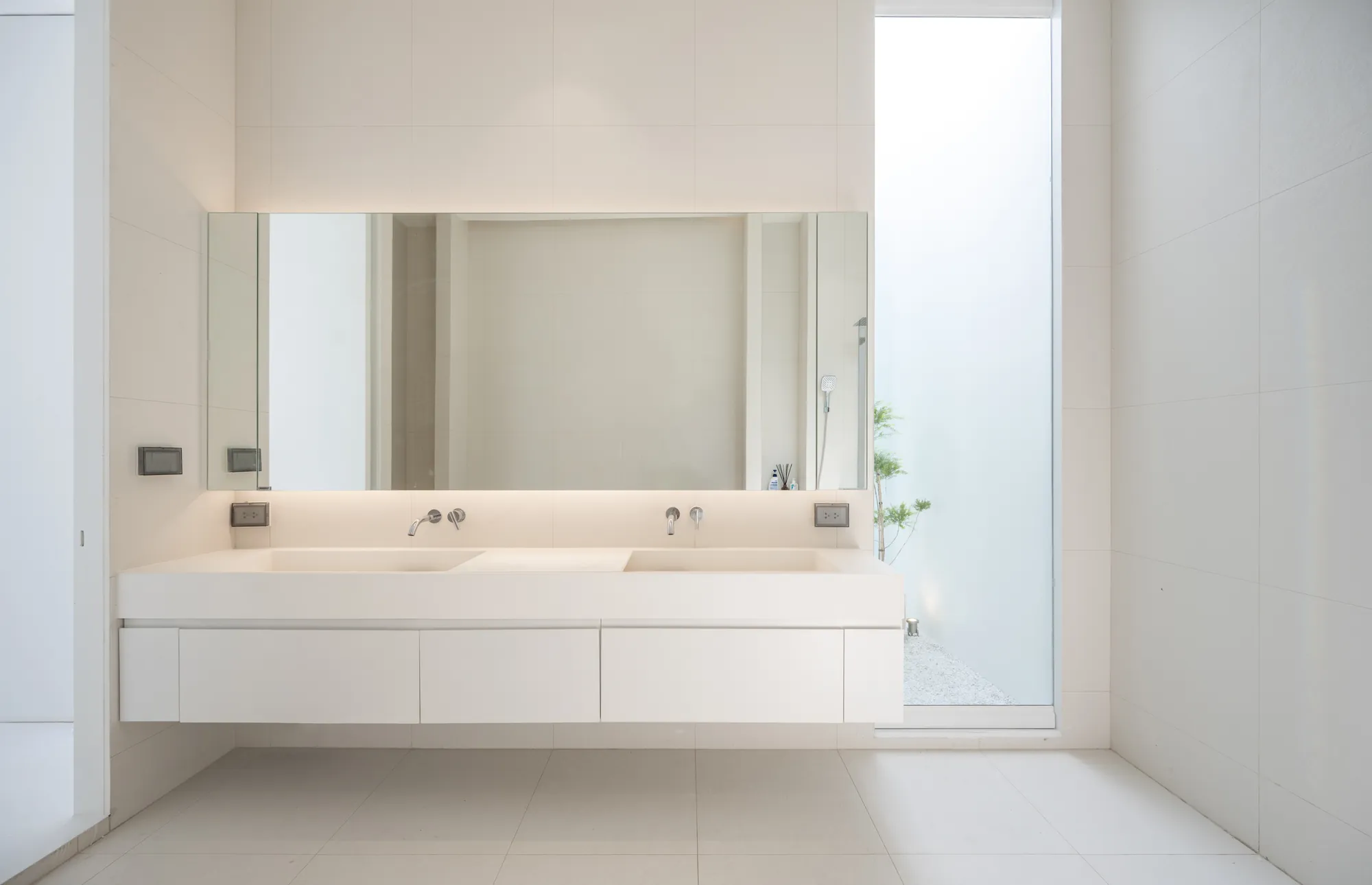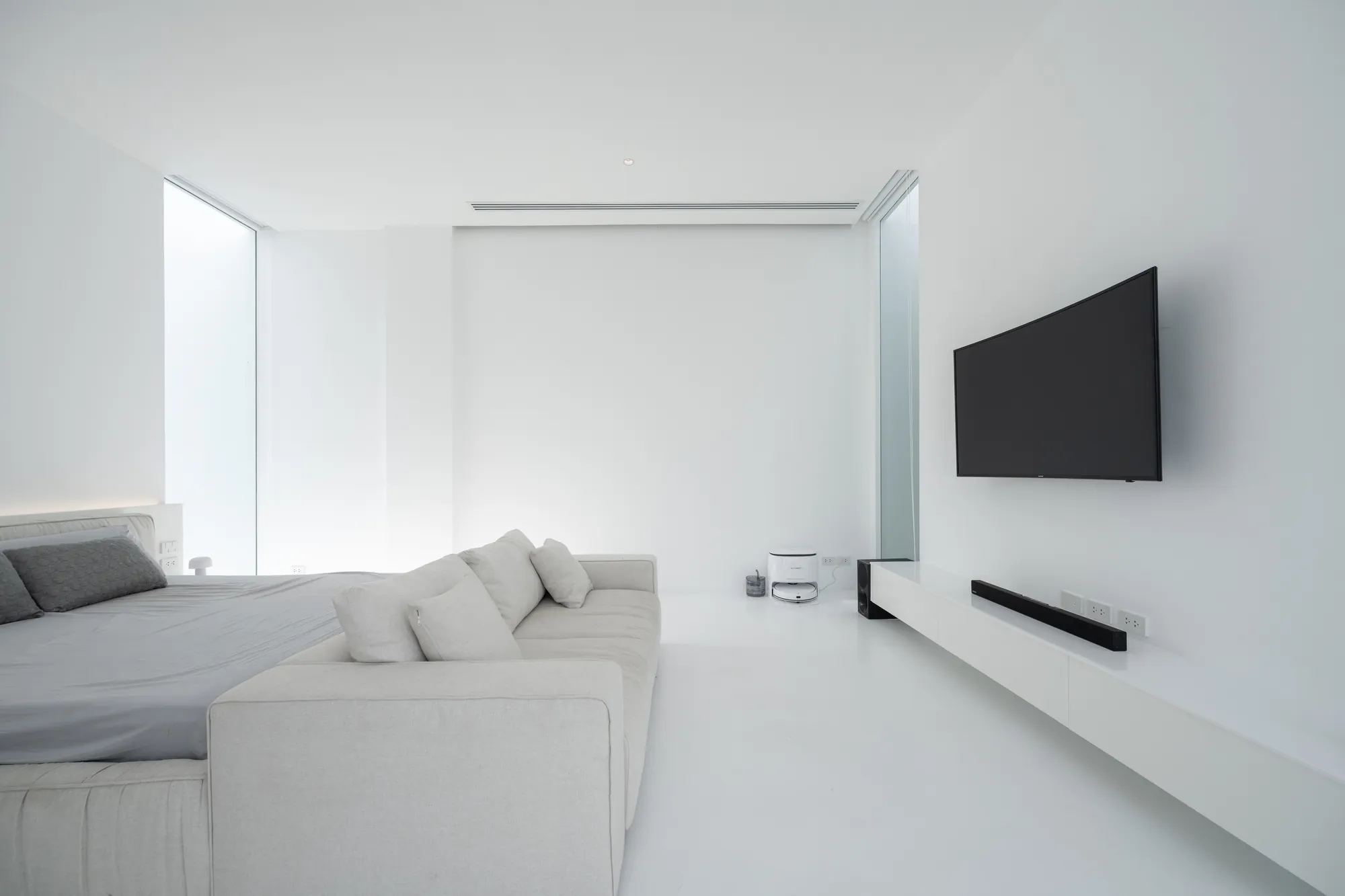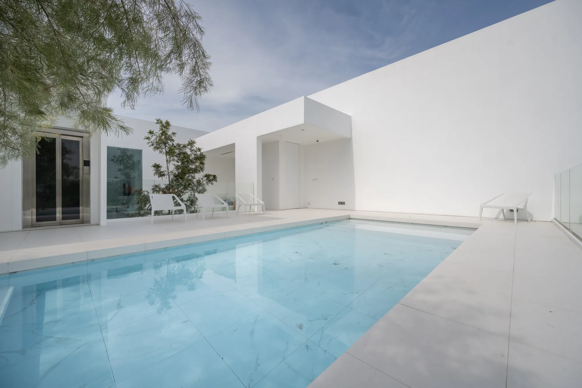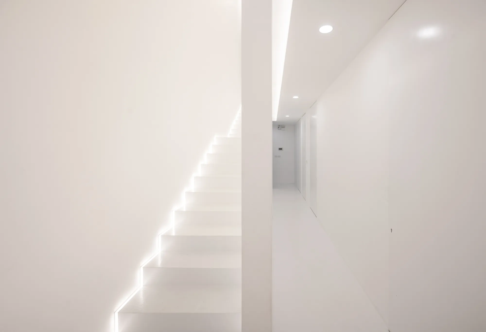 The architectural elements are designed starting with a large vertical white wall, which not only ensures privacy from neighboring residences but the design also allows for creating a seamless connection to the surroundings.