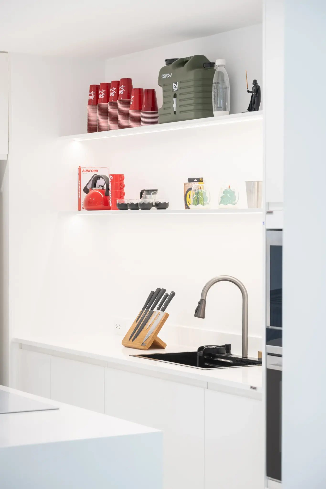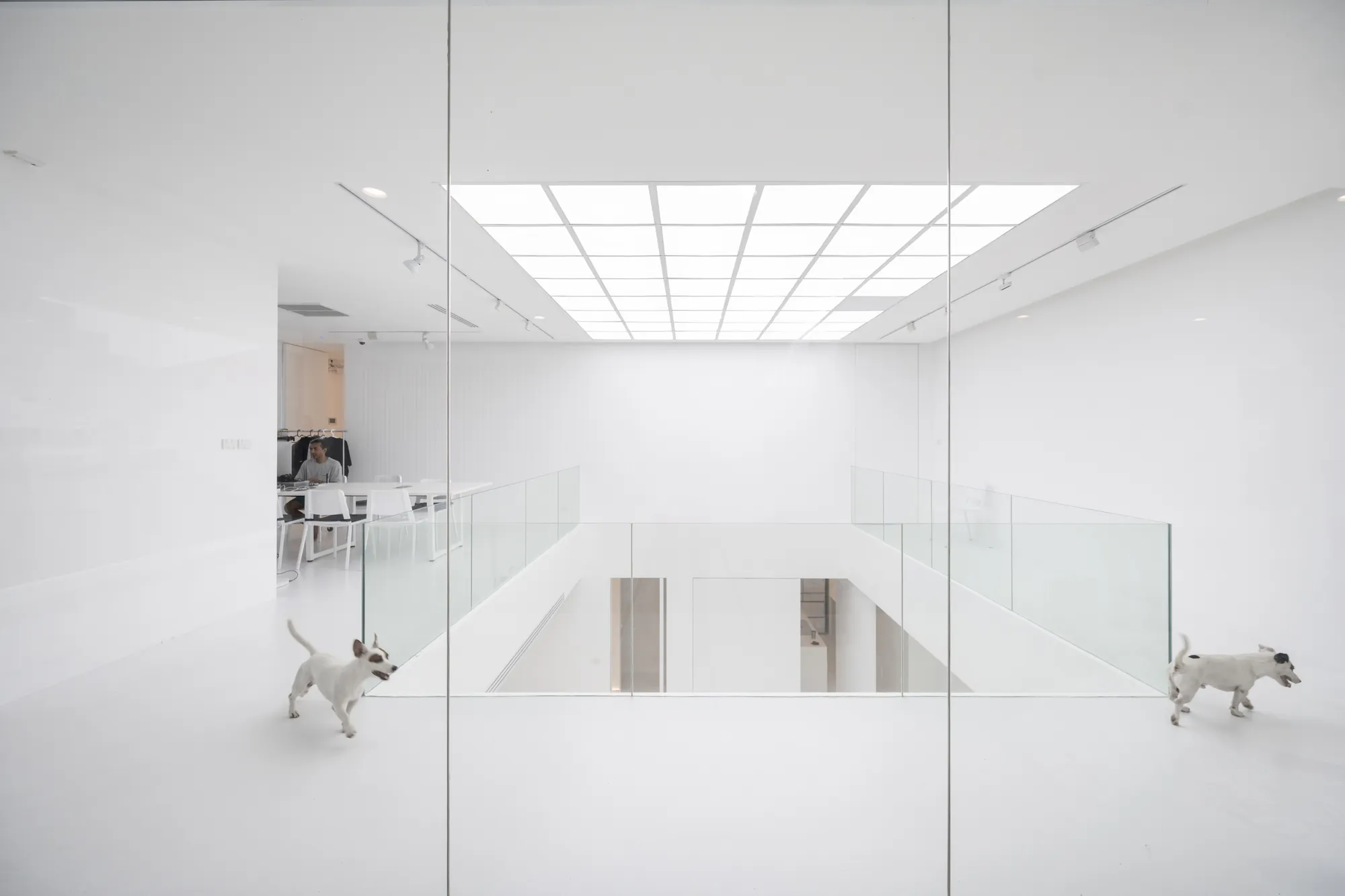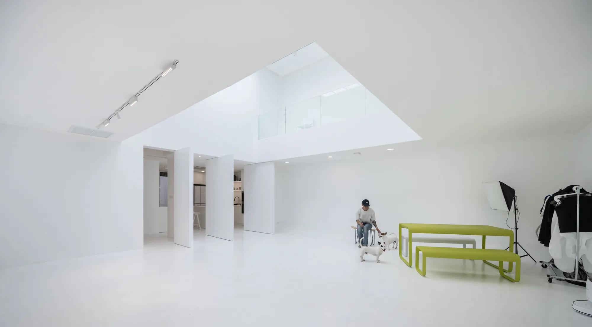 The ground floor is a studio area for photograph works designed as a double space, brightening up the entire space from panel lights overhead. Behind the secret door on this floor is a kitchen and living area that connects to the studio.