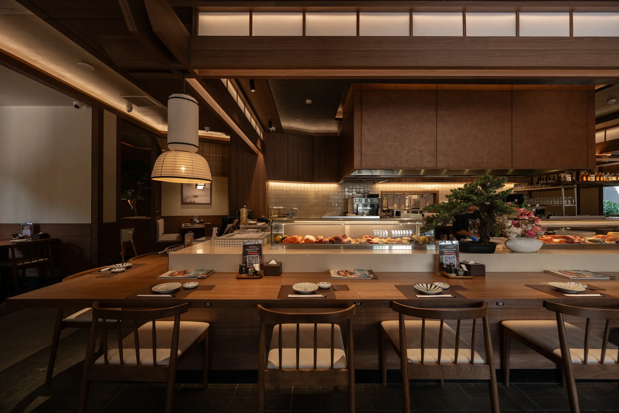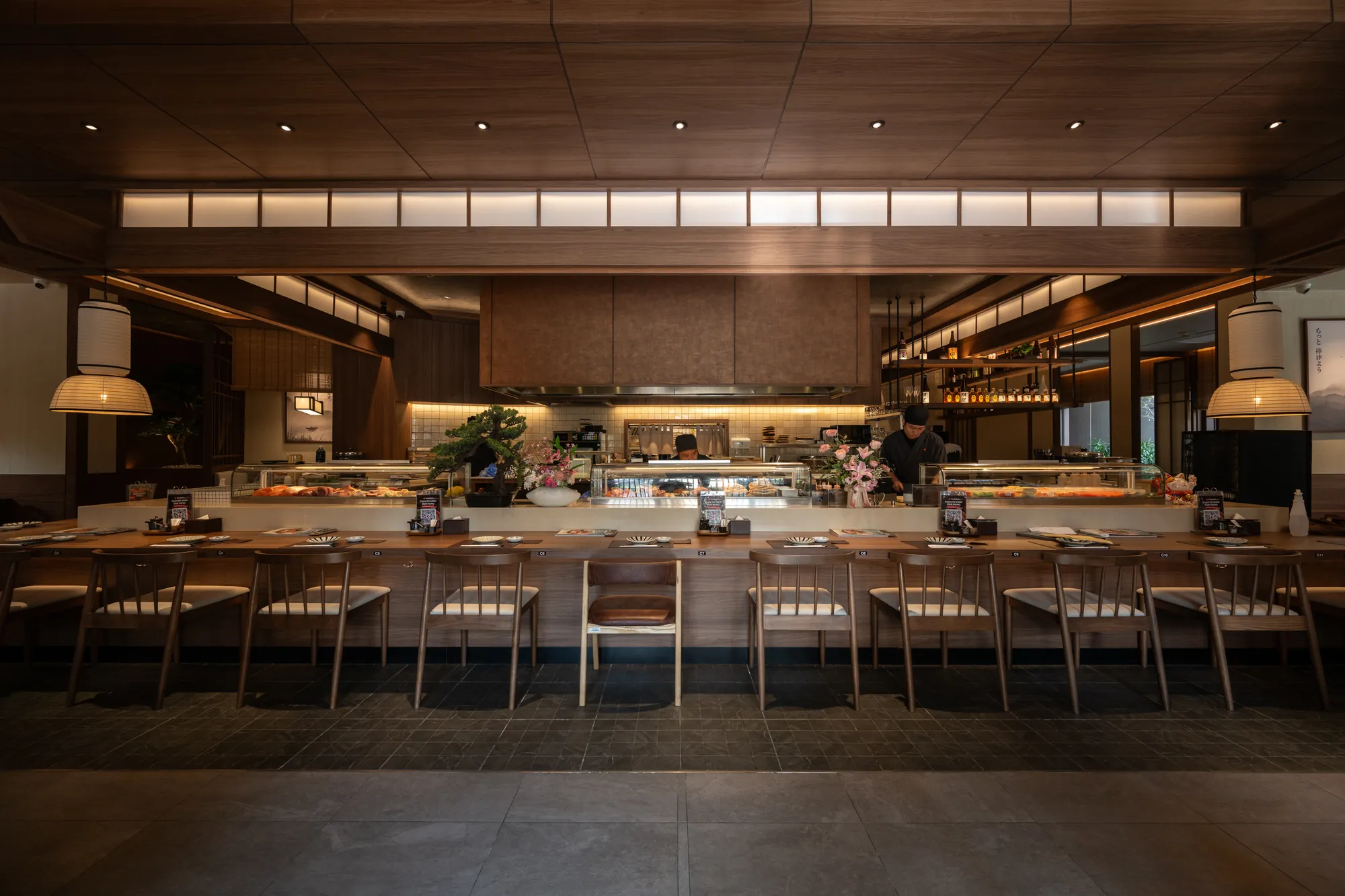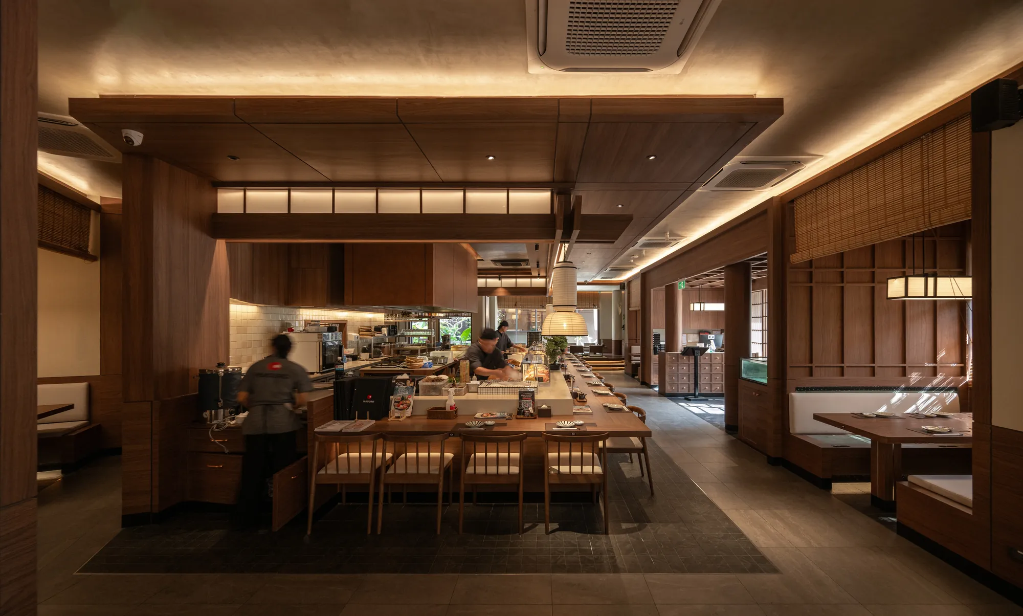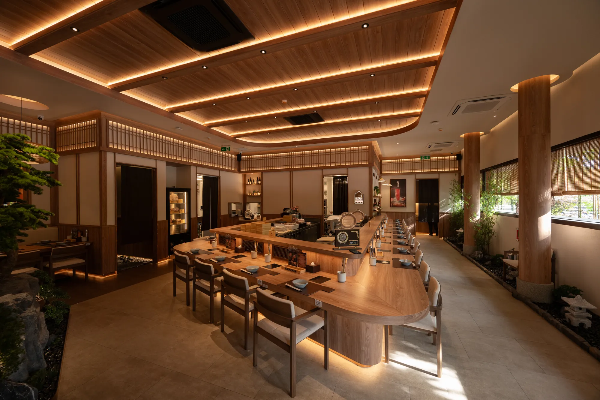 The material selection and architectural details further reinforce the balance between tradition and modernity. Each restaurant’s design evolves from classic Japanese aesthetics to contemporary minimalism, ensuring a cohesive yet dynamic visual language throughout the complex.
