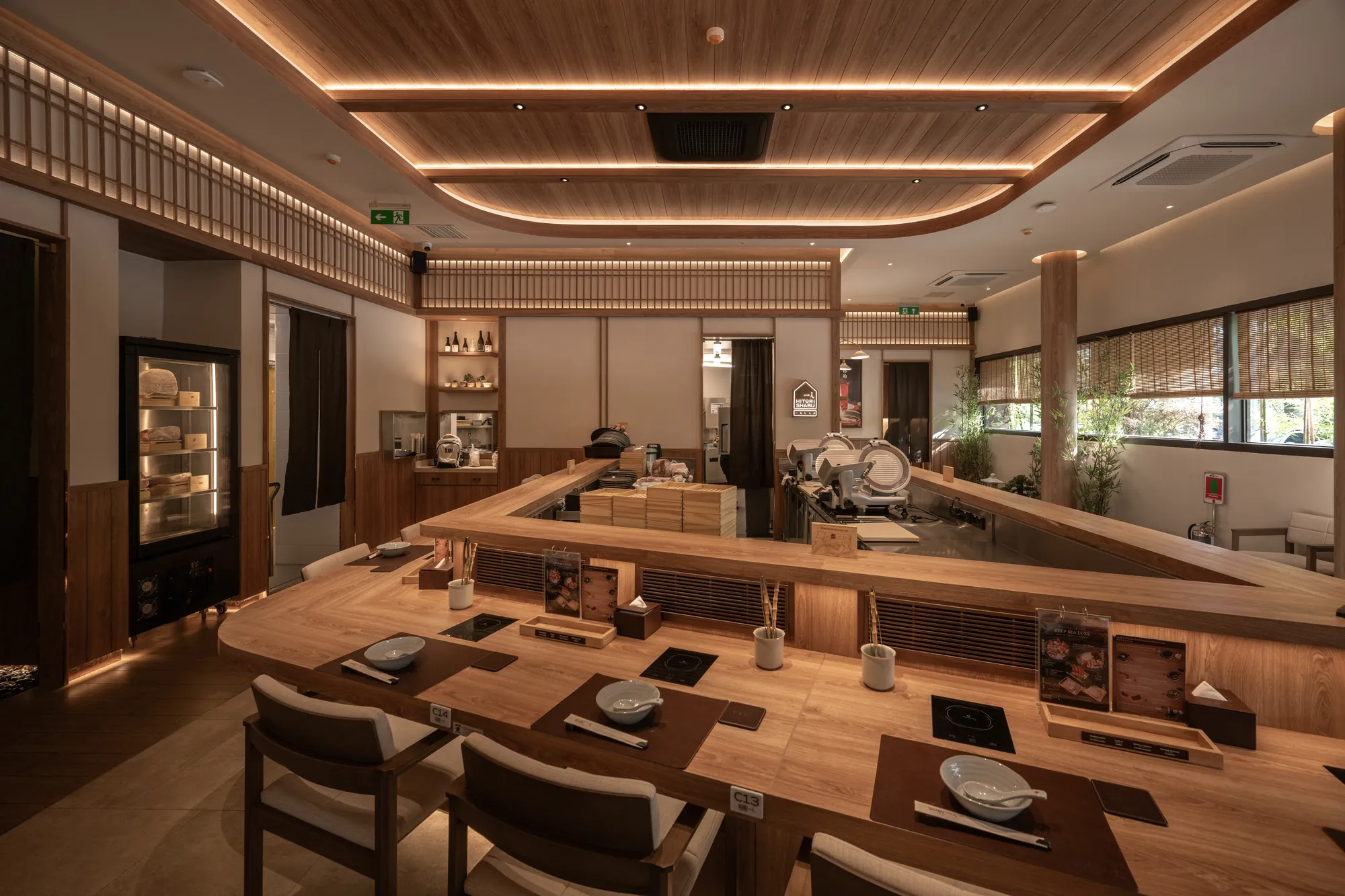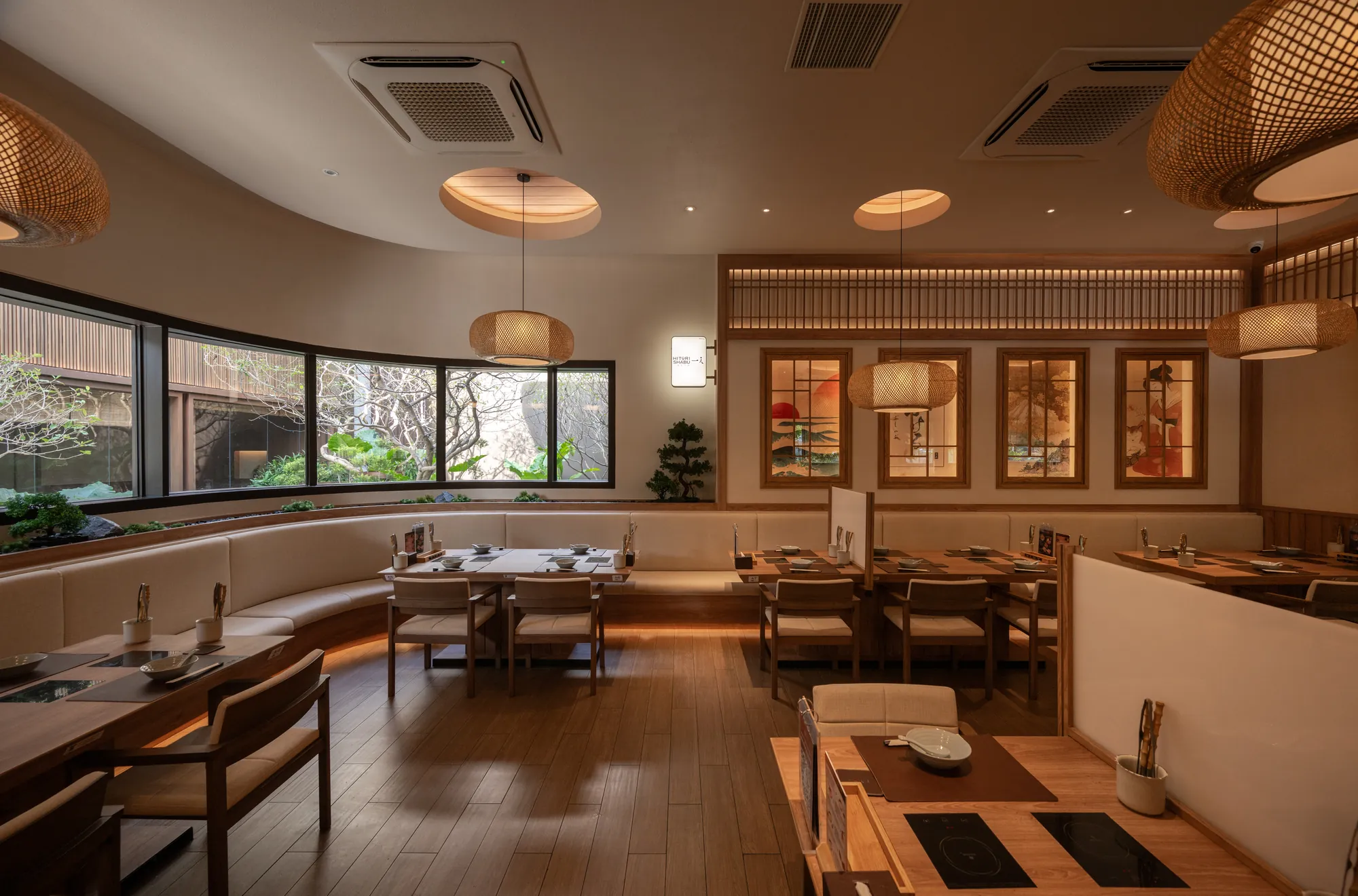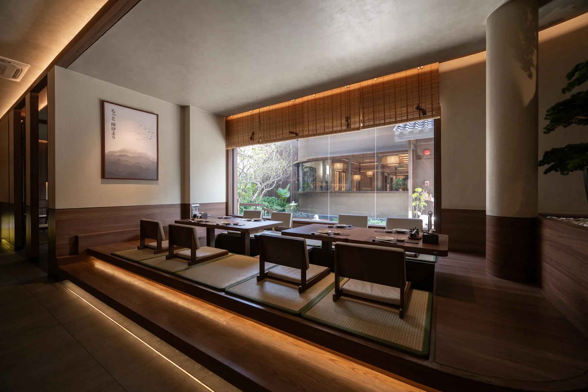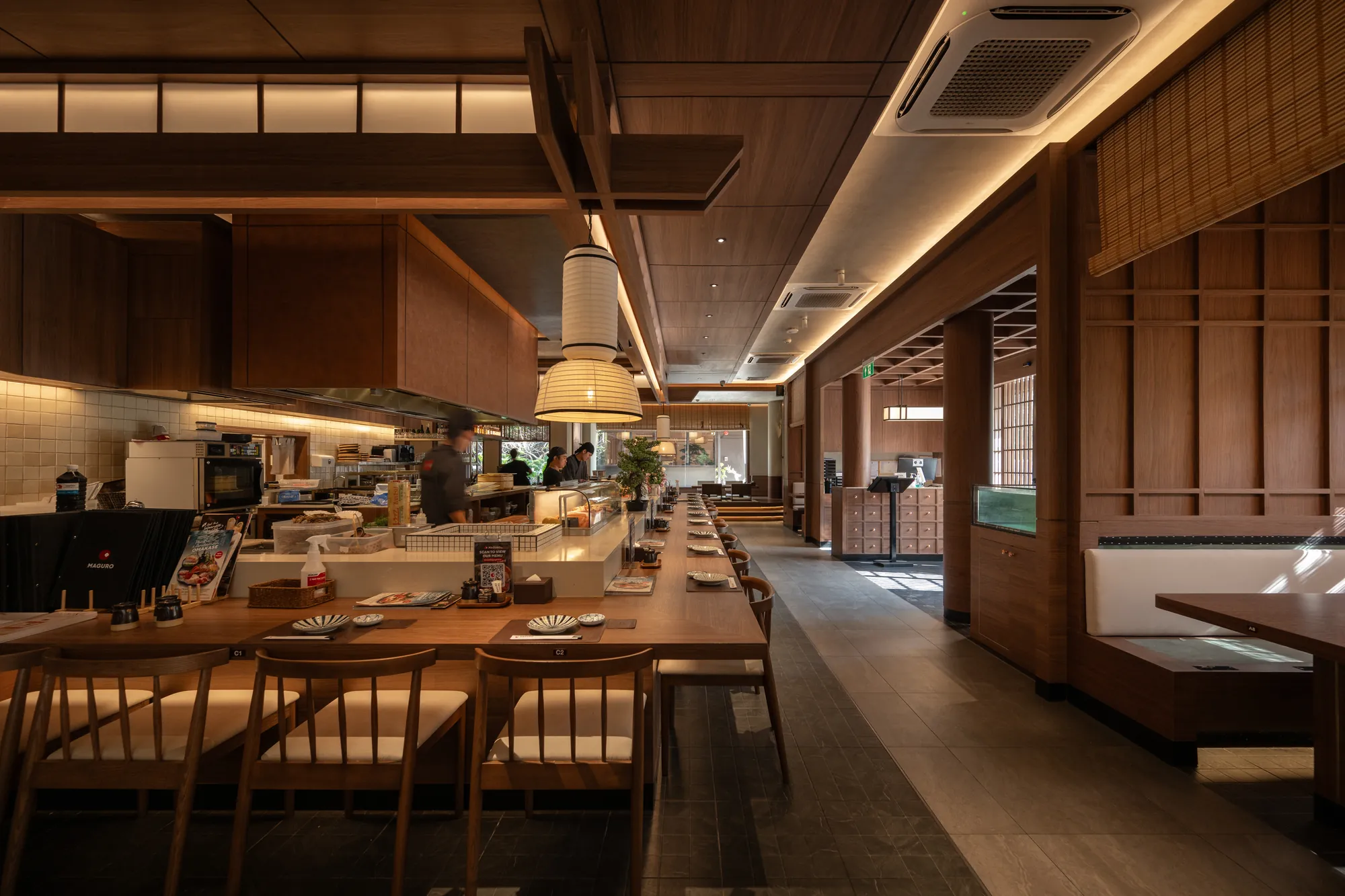 The material selection and architectural details further reinforce the balance between tradition and modernity. Each restaurant’s design evolves from classic Japanese aesthetics to contemporary minimalism, ensuring a cohesive yet dynamic visual language throughout the complex.