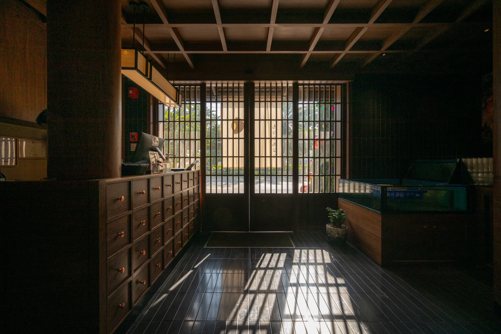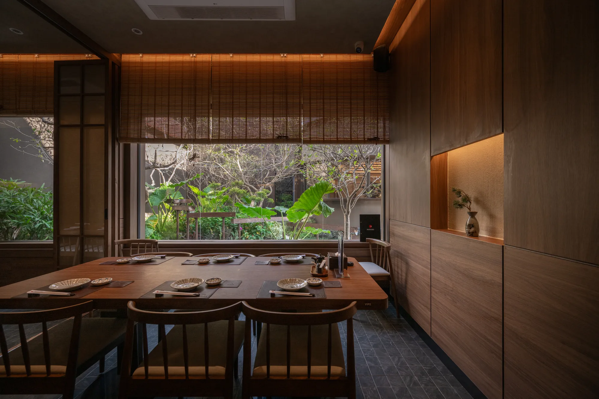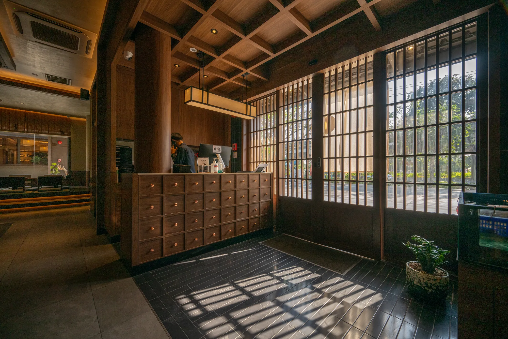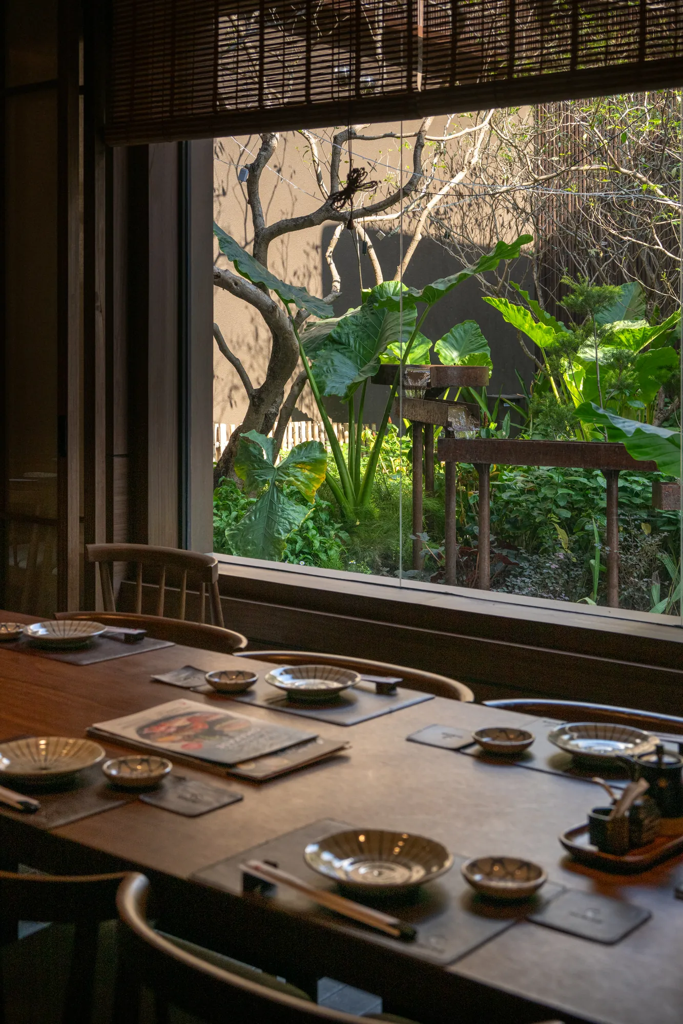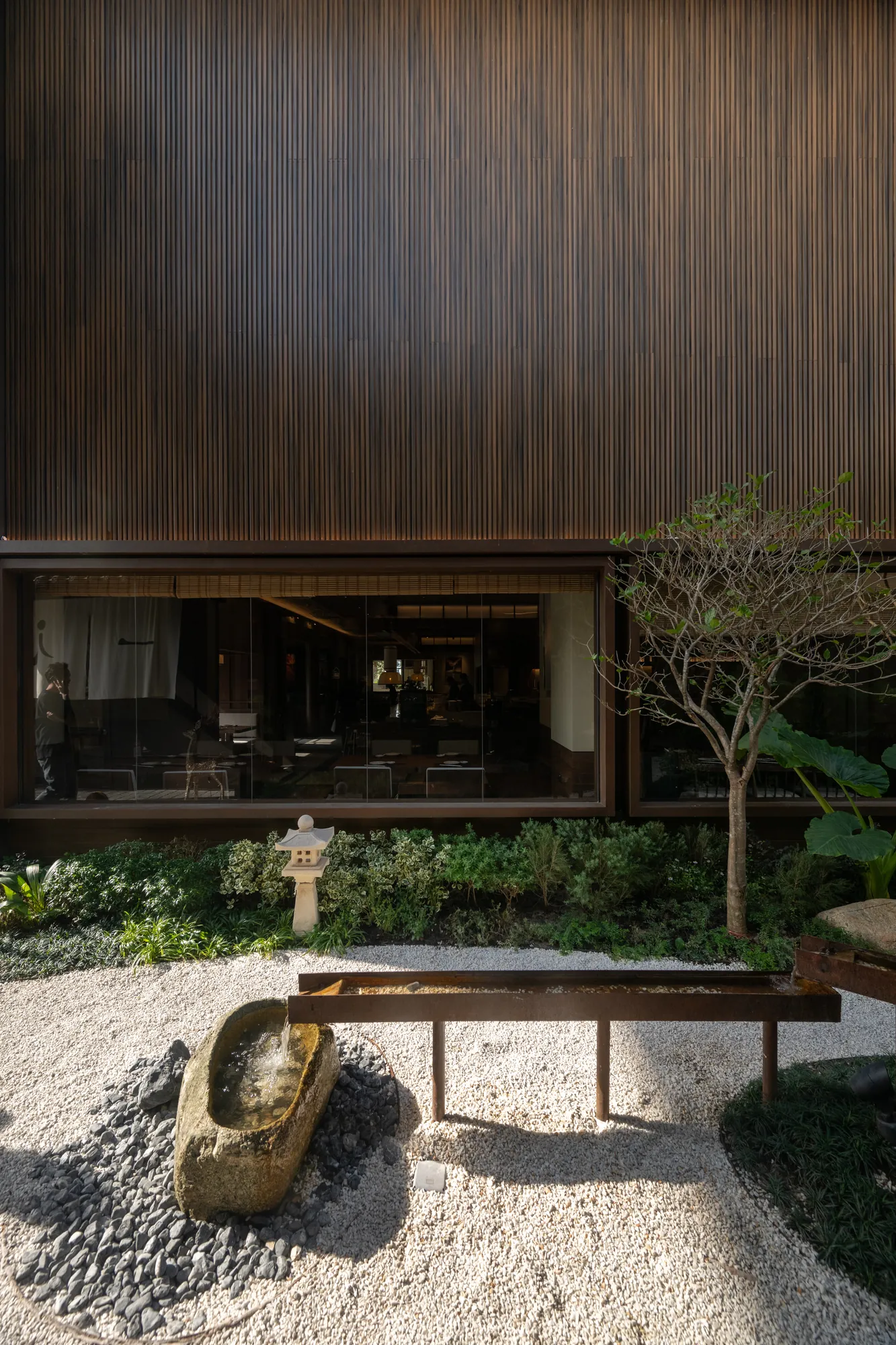 Beyond serving as a mere circulation, the interstitial areas between buildings have emerged into a serene Japanese garden. Carefully arranged stones, trees, and waterfalls interact with architectural openings and sightlines, fostering a tranquil atmosphere that extends into the dining spaces. This seamless integration of architecture and nature enriches the dining experience, offering a peaceful retreat from the urban environment.